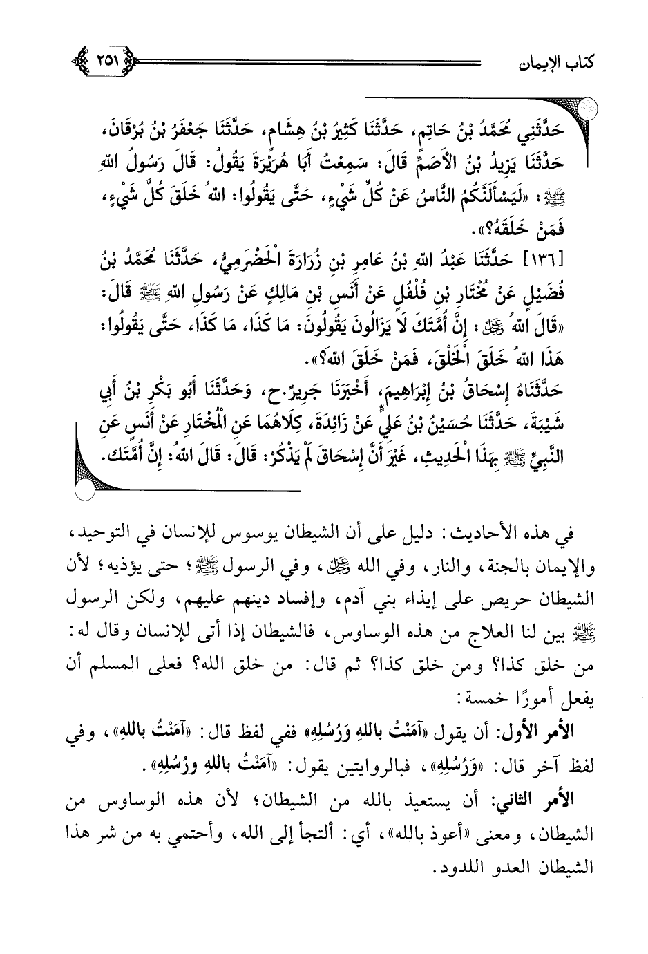 [١٣٦] حَدَّثَنَا عَبْدُ اللَّهِ بْنُ عَامِرِ بْنِ زُرَارَةَ الْحَضْرَمِيُّ، حَدَّثَنَا مُحَمَّدُ بْنُ فُضَيْلٍ عَنْ مُخْتَارِ بْنِ فُلْفُلٍ عَنْ أَنَسِ بْنِ مَالِكٍ عَنْ رَسُولِ اللَّهِ صلى الله عليه وسلم قَالَ: ((قَالَ اللَّهُ عز وجل: إِنَّ أُمَّتَكَ لَا يَزَالُونَ يَقُولُونَ: مَا كَذَا، مَا كَذَا، حَتَّى يَقُولُوا: هَذَا اللَّهُ خَلَقَ الْخَلْقَ، فَمَنْ خَلَقَ اللَّهَ؟ )).