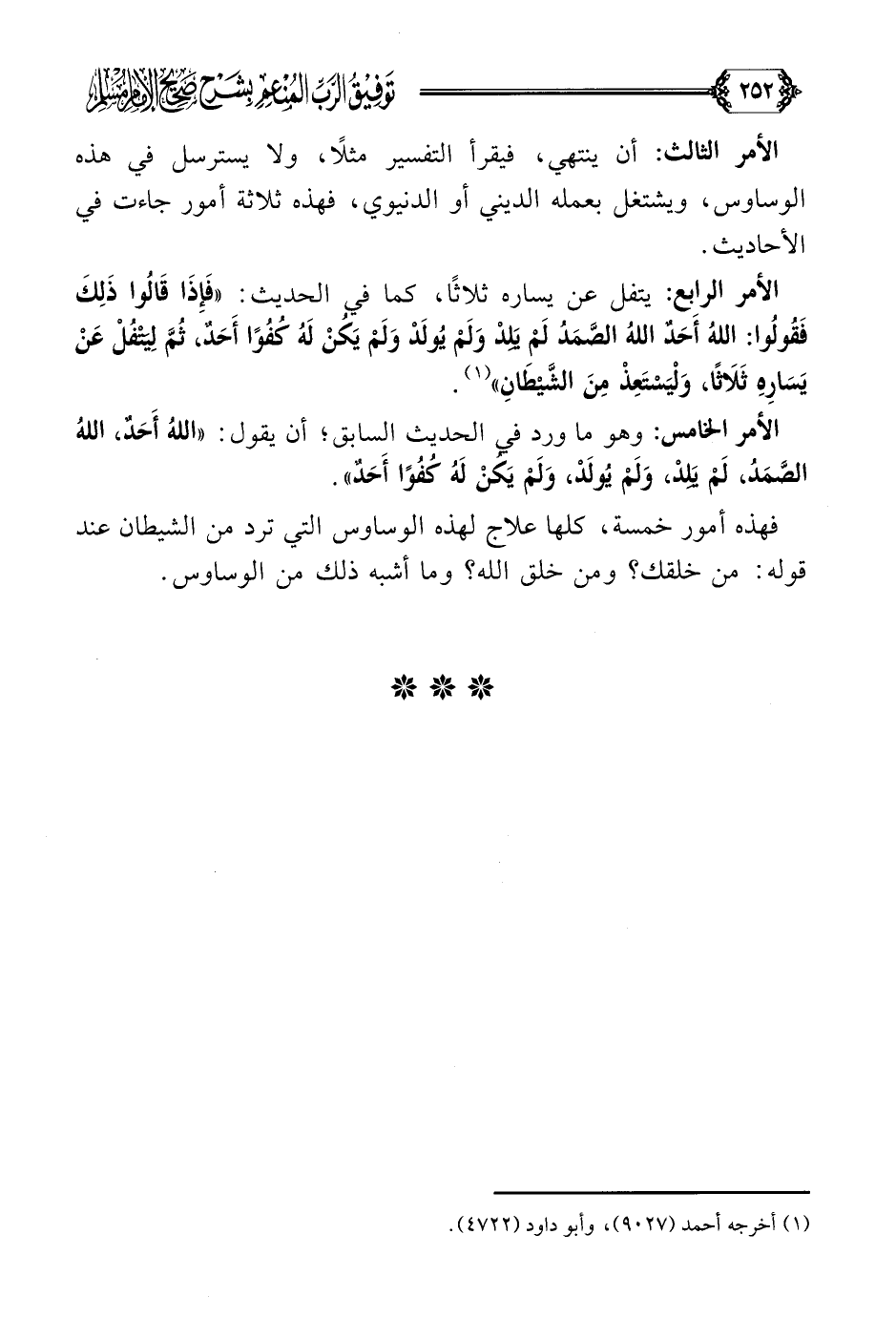 الأمر الرابع: يتقل عن يساره ثلاثا، كما في المسند وسنن أبي داود: ((فَإِذَا قَالُوا ذَلِكَ فَقُولُوا: اللَّهُ أَحَدٌ اللَّهُ الصَّمَدُ لَمْ يَلِدْ وَلَمْ يُولَدْ وَلَمْ يَكُنْ لَهُ كُفُوًا أَحَدٌ، ثُمَّ لِيَتْفُلْ عَنْ يَسَارِهِ ثَلَاثًا، وَلْيَسْتَعِذْ مِنَ الشَّيْطَانِ)) (¬١).