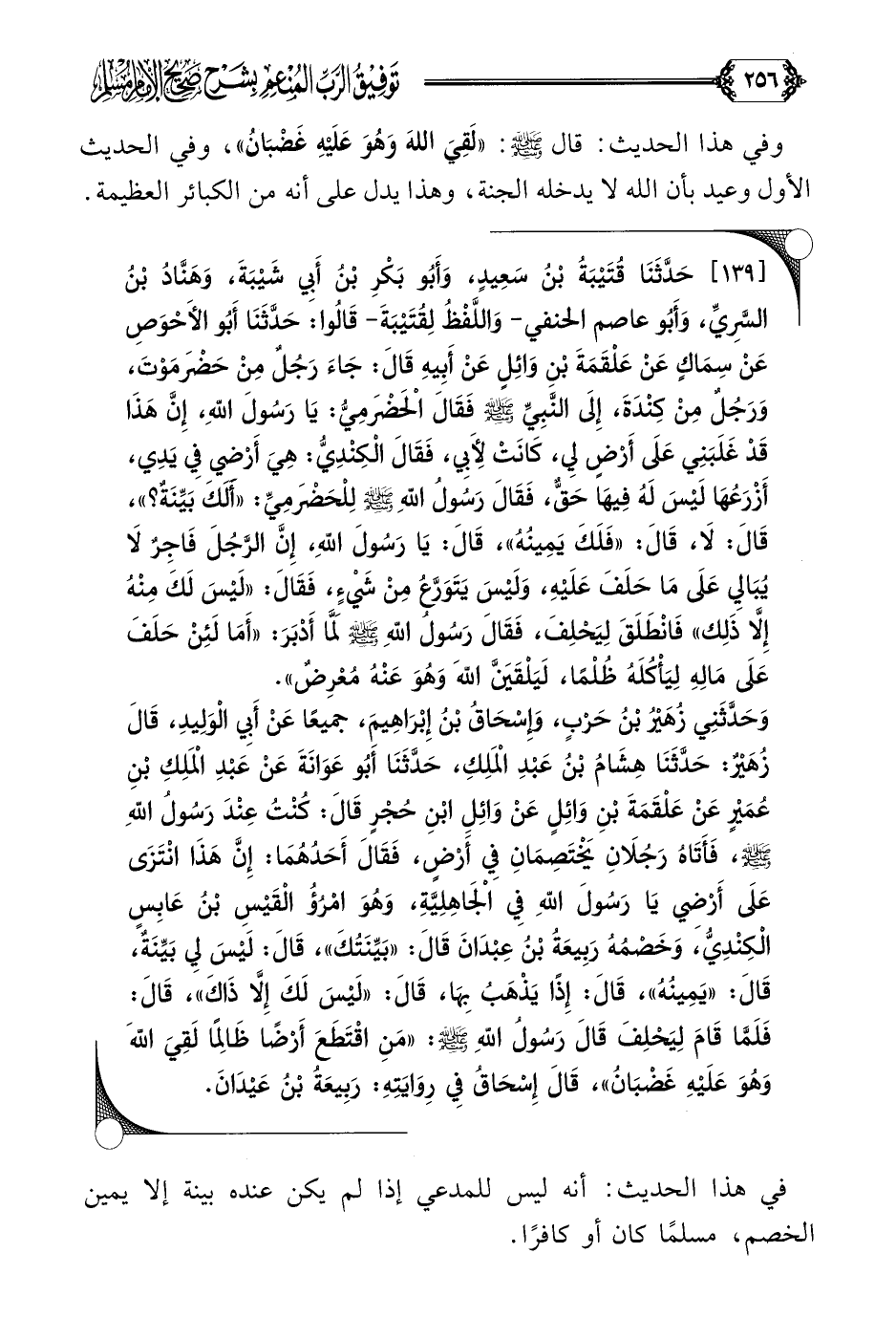 [١٣٩] حَدَّثَنَا قُتَيْبَةُ بْنُ سَعِيدٍ، وَأَبُو بَكْرِ بْنُ أَبِي شَيْبَةَ، وَهَنَّادُ بْنُ السَّرِيِّ، وَأَبُو عاصم الحنفي- وَاللَّفْظُ لِقُتَيْبَةَ- قَالُوا: حَدَّثَنَا أَبُو الأَحْوَصِ عَنْ سِمَاكٍ عَنْ عَلْقَمَةَ بْنِ وَائِلٍ عَنْ أَبِيهِ قَالَ: جَاءَ رَجُلٌ مِنْ حَضْرَمَوْتَ، وَرَجُلٌ مِنْ كِنْدَةَ، إِلَى النَّبِيِّ صلى الله عليه وسلم فَقَالَ الْحَضْرَمِيُّ: يَا رَسُولَ اللَّهِ، إِنَّ هَذَا قَدْ غَلَبَنِي عَلَى أَرْضٍ لِي، كَانَتْ لِأَبِي، فَقَالَ الْكِنْدِيُّ: هِيَ أَرْضِي فِي يَدِي، أَزْرَعُهَا لَيْسَ لَهُ فِيهَا حَقٌّ، فَقَالَ رَسُولُ اللَّهِ صلى الله عليه وسلم لِلْحَضْرَمِيِّ: ((أَلَكَ بَيِّنَةٌ؟ ))، قَالَ: لَا، قَالَ: ((فَلَكَ يَمِينُهُ))، قَالَ: يَا رَسُولَ اللَّهِ، إِنَّ الرَّجُلَ فَاجِرٌ لَا يُبَالِي عَلَى مَا حَلَفَ عَلَيْهِ، وَلَيْسَ يَتَوَرَّعُ مِنْ شَيْءٍ، فَقَالَ: ((لَيْسَ لَكَ مِنْهُ إِلَّا ذَلِك)) فَانْطَلَقَ لِيَحْلِفَ، فَقَالَ رَسُولُ اللَّهِ صلى الله عليه وسلم لَمَّا أَدْبَرَ: ((أَمَا لَئِنْ حَلَفَ عَلَى مَالِهِ لِيَأْكُلَهُ ظُلْمًا، لَيَلْقَيَنَّ اللَّهَ وَهُوَ عَنْهُ مُعْرِضٌ)).