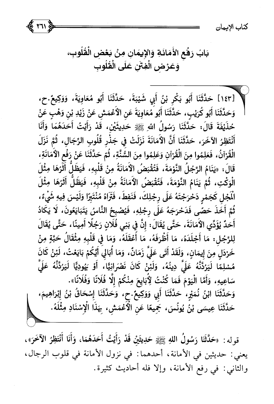 [١٤٣] حَدَّثَنَا أَبُو بَكْرِ بْنُ أَبِي شَيْبَةَ، حَدَّثَنَا أَبُو مُعَاوِيَةَ، وَوَكِيعٌ. ح، وَحَدَّثَنَا أَبُو كُرَيْبٍ، حَدَّثَنَا أَبُو مُعَاوِيَةَ عَنِ الأَعْمَشِ عَنْ زَيْدِ بْنِ وَهْبٍ عَنْ حُذَيْفَةَ قَالَ: حَدَّثَنَا رَسُولُ اللَّهِ صلى الله عليه وسلم حَدِيثَيْنِ، قَدْ رَأَيْتُ أَحَدَهُمَا وَأَنَا أَنْتَظِرُ الآخَرَ، حَدَّثَنَا أَنَّ الأَمَانَةَ نَزَلَتْ فِي جَذْرِ قُلُوبِ الرِّجَالِ، ثُمَّ نَزَلَ الْقُرْآنُ، فَعَلِمُوا مِنَ الْقُرْآنِ وَعَلِمُوا مِنَ السُّنَّةِ، ثُمّ حَدَّثَنَا عَنْ رَفْعِ الأَمَانَةِ، قَالَ: ((يَنَامُ الرَّجُلُ النَّوْمَةَ، فَتُقْبَضُ الأَمَانَةُ مِنْ قَلْبِهِ، فَيَظَلُّ أَثَرُهَا مِثْلَ الْوَكْتِ، ثُمَّ يَنَامُ النَّوْمَةَ، فَتُقْبَضُ الأَمَانَةُ مِنْ قَلْبِهِ، فَيَظَلُّ أَثَرُهَا مِثْلَ الْمَجْلِ كَجَمْرٍ دَحْرَجْتَهُ عَلَى رِجْلِكَ، فَنَفِطَ، فَتَرَاهُ مُنْتَبِرًا وَلَيْسَ فِيهِ شَيْءٌ، ثُمَّ أَخَذَ حَصًى فَدَحْرَجَهُ عَلَى رِجْلِهِ، فَيُصْبِحُ النَّاسُ يَتَبَايَعُونَ، لَا يَكَادُ أَحَدٌ يُؤَدِّي الأَمَانَةَ، حَتَّى يُقَالَ: إِنَّ فِي بَنِي فُلَانٍ رَجُلًا أَمِينًا، حَتَّى يُقَالَ لِلرَّجُلِ: مَا أَجْلَدَهُ، مَا أَظْرَفَهُ، مَا أَعْقَلَهُ، وَمَا فِي قَلْبِهِ مِثْقَالُ حَبَّةٍ مِنْ خَرْدَلٍ مِنَ إِيمَانٍ، وَلَقَدْ أَتَى عَلَيَّ زَمَانٌ، وَمَا أُبَالِي أَيَّكُمْ بَايَعْتُ، لَئِنْ كَانَ مُسْلِمًا لَيَرُدَّنَّهُ عَلَيَّ دِينُهُ، وَلَئِنْ كَانَ نَصْرَانِيًّا، أَوْ يَهُودِيًّا لَيَرُدَّنَّهُ عَلَيَّ سَاعِيهِ، وَأَمَّا الْيَوْمَ فَمَا كُنْتُ لِأُبَايِعَ مِنْكُمْ إِلَّا فُلَانًا وَفُلَانًا)).