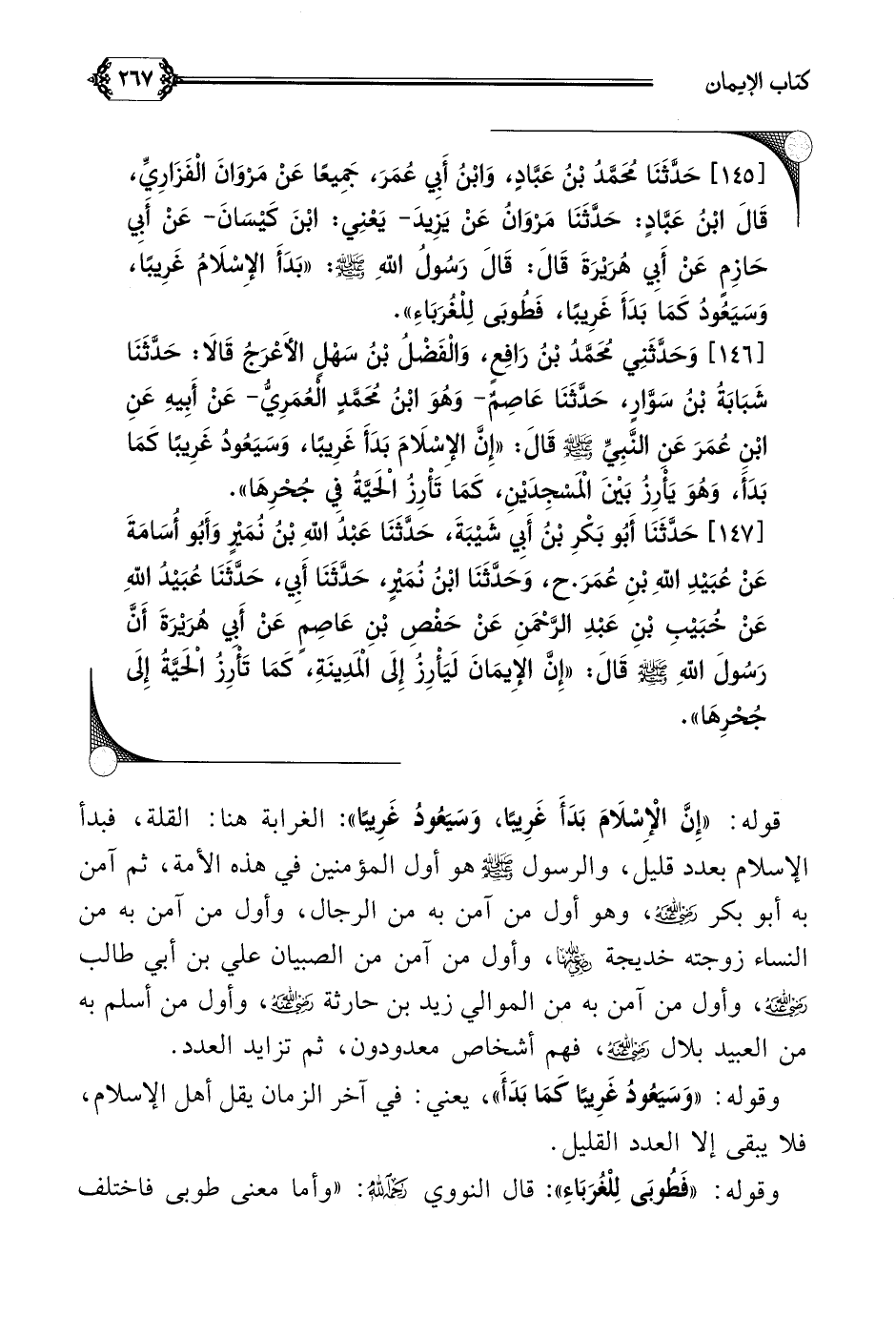 قوله: ((إِنَّ الْإِسْلَامَ بَدَأَ غَرِيبًا، وَسَيَعُودُ غَرِيبًا)) الغرابة هنا: القلة، فبدأ الإسلام بعدد قليل، والرسول صلى الله عليه وسلم هو أول المؤمنين في هذه الأمة، ثم آمن به أبو بكر رضي الله عنه، وهو أول من آمن به من الرجال، وأول من آمن به من النساء زوجته خديجة رضي الله عنها، وأول من آمن من الصبيان علي بن أبي طالب رضي الله عنه، وأول من آمن به من الموالي زيد بن حارثة رضي الله عنه، وأول من أسلم به من العبيد بلال رضي الله عنه، فهم أشخاص معدودون، ثم تزايد العدد.