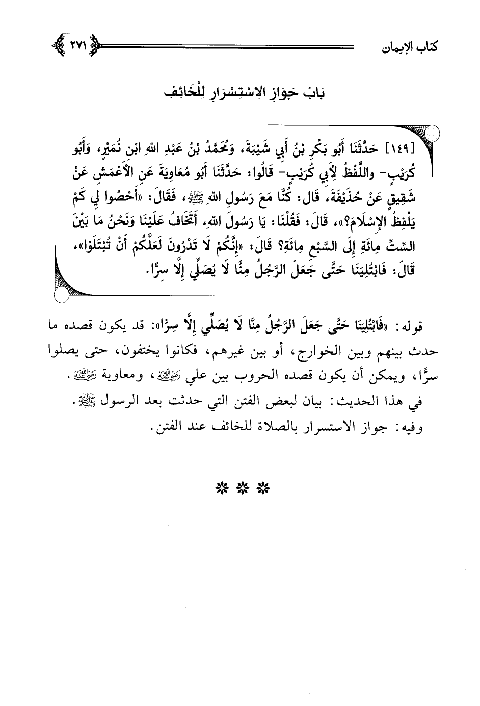[١٤٩] حَدَّثَنَا أَبُو بَكْرِ بْنُ أَبِي شَيْبَةَ، وَمُحَمَّدُ بْنُ عَبْدِ اللَّهِ ابْنِ نُمَيْرٍ، وَأَبُو كُرَيْبٍ- واللَّفْظُ لِأَبِي كُرَيْبٍ- قَالُوا: حَدَّثَنَا أَبُو مُعَاوِيَةَ عَنِ الأَعْمَشِ عَنْ شَقِيقٍ عَنْ حُذَيْفَةَ، قَال: كُنَّا مَعَ رَسُولِ اللَّهِ صلى الله عليه وسلم، فَقَالَ: ((أَحْصُوا لِي كَمْ يَلْفِظُ الإِسْلَامَ؟ ))، قَالَ: فَقُلْنَا: يَا رَسُولَ اللَّهِ، أَتَخَافُ عَلَيْنَا وَنَحْنُ مَا بَيْنَ السِّتِّ مِائَةِ إِلَى السَّبْعِ مِائَةِ؟ قَالَ: ((إِنَّكُمْ لَا تَدْرُونَ لَعَلَّكُمْ أَنْ تُبْتَلَوْا))، قَالَ: فَابْتُلِيَنَا حَتَّى جَعَلَ الرَّجُلُ مِنَّا لَا يُصَلِّي إِلَّا سِرًّا.