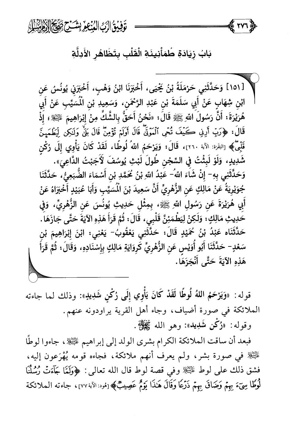 [١٥١] وَحَدَّثَنِي حَرْمَلَةُ بْنُ يَحْيَى، أَخْبَرَنَا ابْنُ وَهْبٍ، أَخْبَرَنِي يُونُسُ عَنِ ابْنِ شِهَابٍ عَنْ أَبِي سَلَمَةَ بْنِ عَبْدِ الرَّحْمَنِ، وَسَعِيدِ بْنِ الْمُسَيِّبِ عَنْ أَبِي هُرَيْرَةَ: أَنَّ رَسُولَ اللَّهِ صلى الله عليه وسلم قَالَ: ((نَحْنُ أَحَقُّ بِالشَّكِّ مِنْ إِبْرَاهِيمَ عَلَيْهِ السَّلامُ؛ إِذْ قَالَ: {رَبِّ أَرِنِي كَيْفَ تُحْيِي الْمَوْتَى قَالَ أَوَلَمْ تُؤْمِنْ قَالَ بَلَى وَلَكِنْ لِيَطْمَئِنَّ قَلْبِي}، قَالَ: وَيَرْحَمُ اللَّهُ لُوطًا، لَقَدْ كَانَ يَأْوِي إِلَى رُكْنٍ شَدِيدٍ، وَلَوْ لَبِثْتُ فِي السِّجْنِ طُولَ لَبْثِ يُوسُفَ لَأَجَبْتُ الدَّاعِيَ)).
