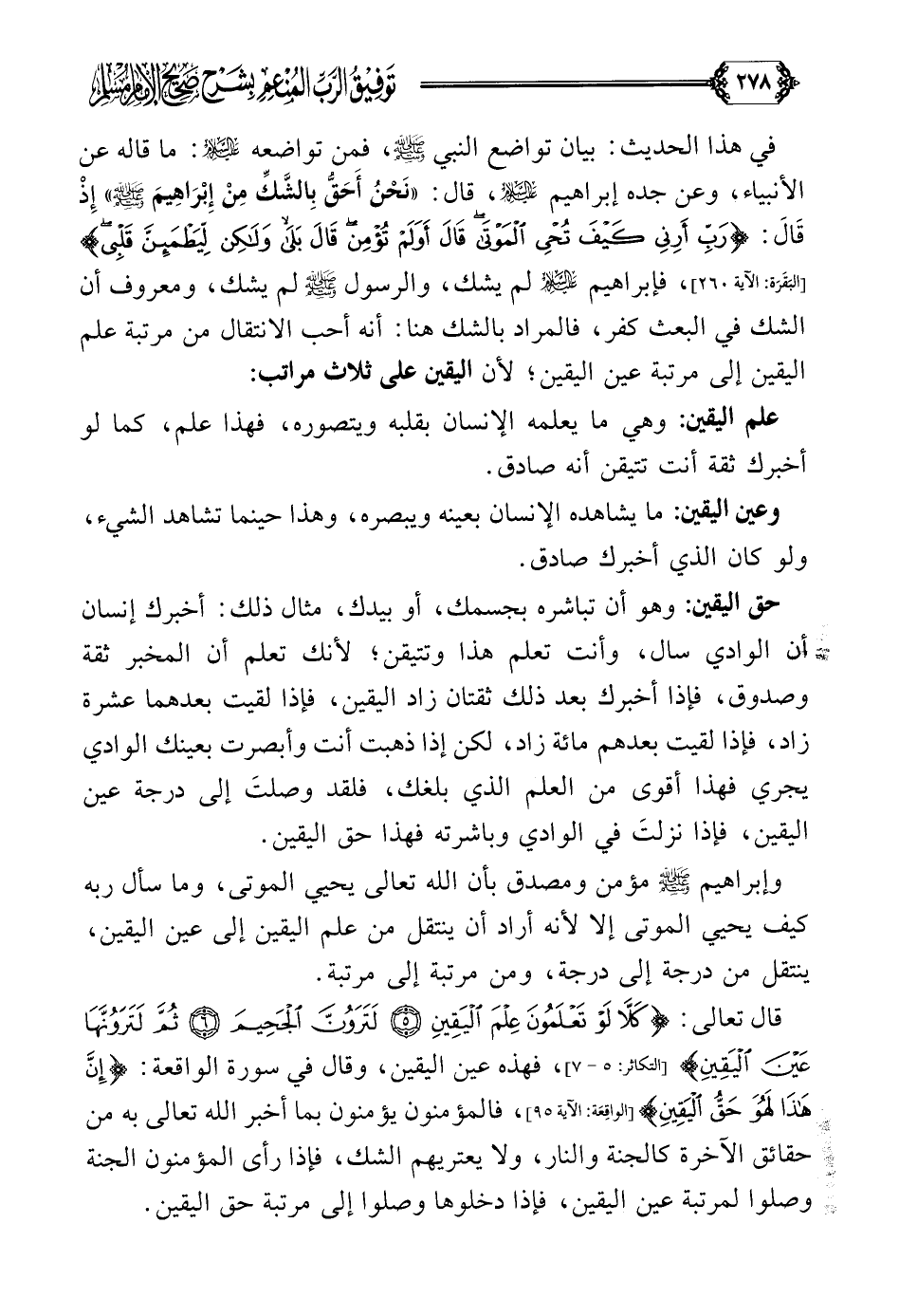 هذا الحديث فيه: بيان تواضع النبي صلى الله عليه وسلم، فمن تواضعه عليه السلام ما قاله عن الأنبياء، وعن جده إبراهيم عليه السلام، قال: ((نَحْنُ أَحَقُّ بِالشَّكِّ مِنْ إِبْرَاهِيمَ صلى الله عليه وسلم)) إِذْ قَالَ: {رَبِّ أَرِنِي كَيْفَ تُحْيِي الْمَوْتَى قَالَ أَوَ لَمْ تُؤْمِنْ قَالَ بَلَى وَلَكِنْ لِيَطْمَئِنَّ قَلْبِي}، فإبراهيم عليه السلام لم يشك، والرسول صلى الله عليه وسلم لم يشك، ومعروف أن الشك في البعث كفر، فالمراد بالشك هنا: أنه أحب الانتقال من مرتبة علم اليقين إلى مرتبة عين اليقين؛ لأن اليقين على ثلاث مراتب: