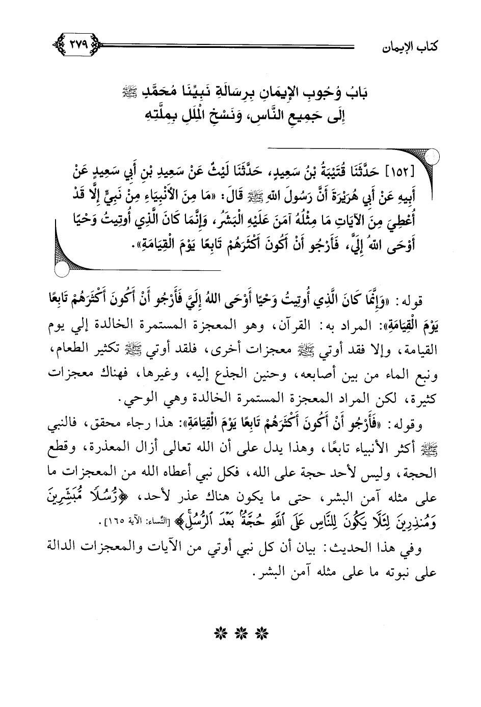 [١٥٢] حَدَّثَنَا قُتَيْبَةُ بْنُ سَعِيدٍ، حَدَّثَنَا لَيْثٌ عَنْ سَعِيدِ بْنِ أَبِي سَعِيدٍ عَنْ أَبِيهِ عَنْ أَبِي هُرَيْرَةَ أَنَّ رَسُولَ اللَّهِ صلى الله عليه وسلم قَالَ: ((مَا مِنَ الأَنْبِيَاءِ مِنْ نَبِيٍّ إِلَّا قَدْ أُعْطِيَ مِنَ الآيَاتِ مَا مِثْلُهُ آمَنَ عَلَيْهِ الْبَشَرُ، وَإِنَّمَا كَانَ الَّذِي أُوتِيتُ وَحْيًا أَوْحَى اللَّهُ إِلَيَّ، فَأَرْجُو أَنْ أَكُونَ أَكْثَرَهُمْ تَابِعًا يَوْمَ الْقِيَامَةِ)).