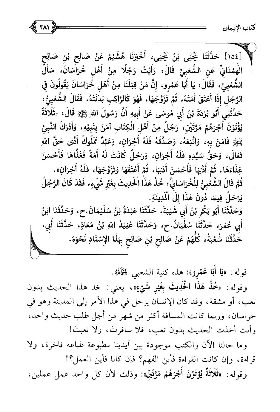 [١٥٤] حَدَّثَنَا يَحْيَى بْنُ يَحْيَى، أَخْبَرَنَا هُشَيْمٌ عَنْ صَالِحِ بْنِ صَالِحٍ الْهَمْدَانِيِّ عَنِ الشَّعْبِيِّ قَالَ: رَأَيْتُ رَجُلًا مِنْ أَهْلِ خُرَاسَانَ، سَأَلَ الشَّعْبِيَّ، فَقَالَ: يَا أَبَا عَمْرٍو، إِنَّ مَنْ قِبَلَنَا مِنْ أَهْلِ خُرَاسَانَ يَقُولُونَ فِي الرَّجُلِ إِذَا أَعْتَقَ أَمَتَهُ، ثُمَّ تَزَوَّجَهَا، فَهُوَ كَالرَّاكِبِ بَدَنَتَهُ، فَقَالَ الشَّعْبِيُّ: حَدَّثَنِي أَبُو بُرْدَةَ بْنُ أَبِي مُوسَى عَنْ أَبِيهِ أَنَّ رَسُولَ اللَّهِ صلى الله عليه وسلم قَالَ: ((ثَلَاثَةٌ يُؤْتَوْنَ أَجْرَهُمْ مَرَّتَيْنِ، رَجُلٌ مِنْ أَهْلِ الْكِتَابِ آمَنَ بِنَبِيِّهِ، وَأَدْرَكَ النَّبِيَّ صلى الله عليه وسلم فَآمَنَ بِهِ، وَاتَّبَعَهُ، وَصَدَّقَهُ فَلَهُ أَجْرَانِ، وَعَبْدٌ مَمْلُوكٌ أَدَّى حَقَّ اللَّهِ تَعَالَى، وَحَقَّ سَيِّدِهِ فَلَهُ أَجْرَانِ، وَرَجُلٌ كَانَتْ لَهُ أَمَةٌ فَغَذَّاهَا فَأَحْسَنَ غِذَاءَهَا، ثُمَّ أَدَّبَهَا فَأَحْسَنَ أَدَبَهَا، ثُمَّ أَعْتَقَهَا وَتَزَوَّجَهَا، فَلَهُ أَجْرَانِ)).