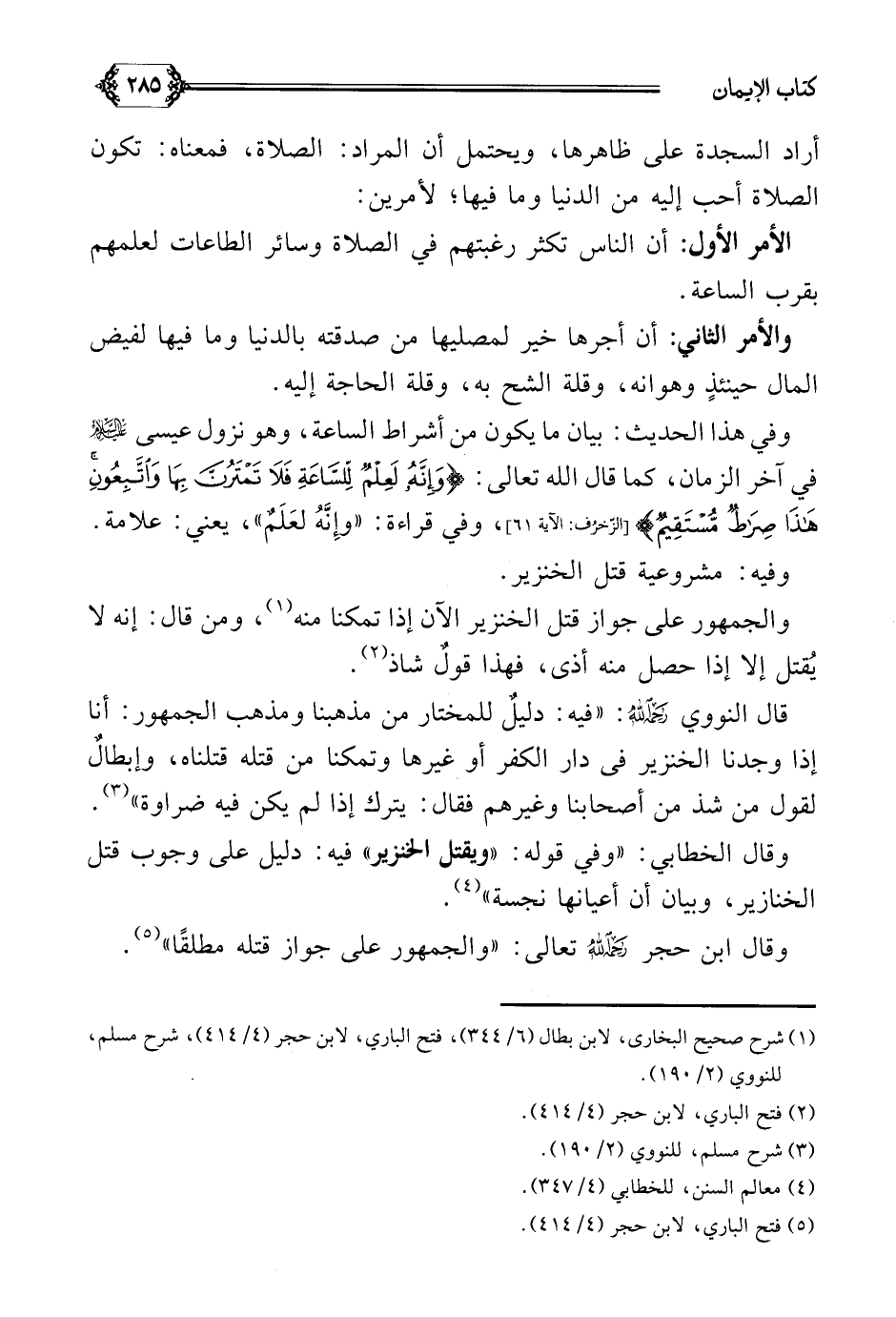 وقال الخطابي: ((وفي قوله: ((ويقتل الخنزير)) فيه دليل على وجوب قتل الخنازير، وبيان أن أعيانها نجسة)) (¬٤).
