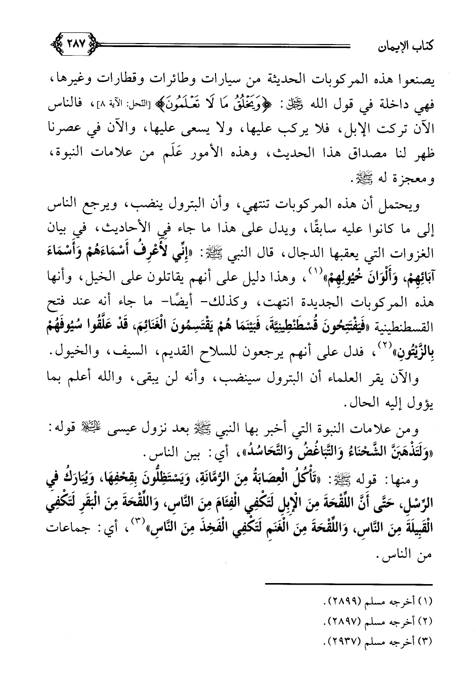 ويحتمل أن هذه المركوبات تنتهي، وأن البترول ينضب، ويرجع الناس إلى ما كانوا عليه سابقًا، ويدل على هذا ما جاء في الأحاديث، في بيان الغزوات التي يعقبها الدجال، قال النبي صلى الله عليه وسلم: ((إِنِّي لَأَعْرِفُ أَسْمَاءَهُمْ وَأَسْمَاءَ آبَائِهِمْ، وَأَلْوَانَ خُيُولِهِمْ)) (¬١)، وهذا دليل على أنهم يقاتلون على الخيل، وأنها هذه المركوبات الجديدة انتهت، وكذلك- أيضًا- ما جاء أنه عند فتح القسطنطينية ((فَيَفْتَتِحُونَ قُسْطَنْطِينِيَّةَ، فَبَيْنَمَا هُمْ يَقْتَسِمُونَ الْغَنَائِمَ، قَدْ عَلَّقُوا سُيُوفَهُمْ بِالزَّيْتُونِ)) (¬٢)، فدل على أنهم يرجعون للسلاح القديم، السيف، والخيول.