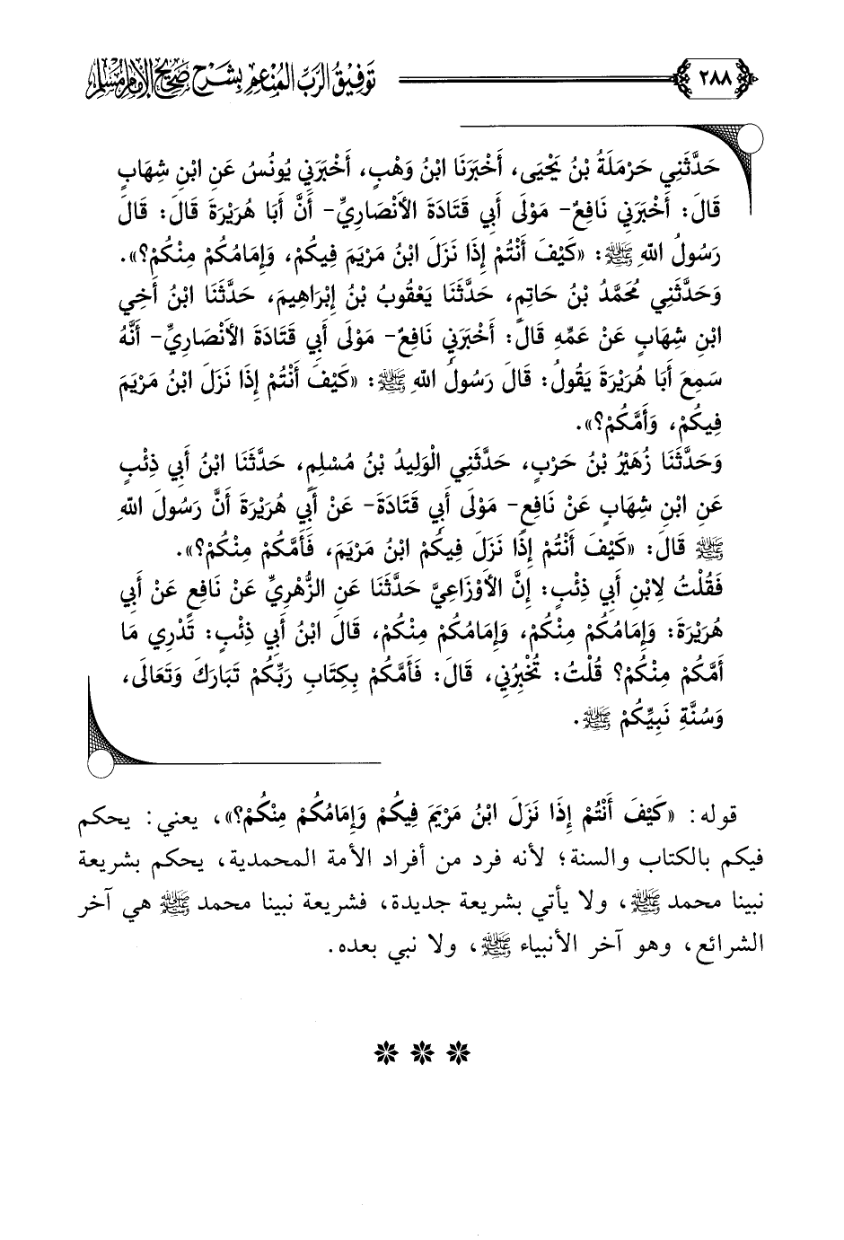 حَدَّثَنِي حَرْمَلَةُ بْنُ يَحْيَى، أَخْبَرَنَا ابْنُ وَهْبٍ، أَخْبَرَنِي يُونُسُ عَنِ ابْنِ شِهَابٍ قَالَ: أَخْبَرَنِي نَافِعٌ- مَوْلَى أَبِي قَتَادَةَ الأَنْصَارِيِّ- أَنَّ أَبَا هُرَيْرَةَ قَالَ: قَالَ رَسُولُ اللَّهِ صلى الله عليه وسلم: ((كَيْفَ أَنْتُمْ إِذَا نَزَلَ ابْنُ مَرْيَمَ فِيكُمْ، وَإِمَامُكُمْ مِنْكُمْ؟ )).