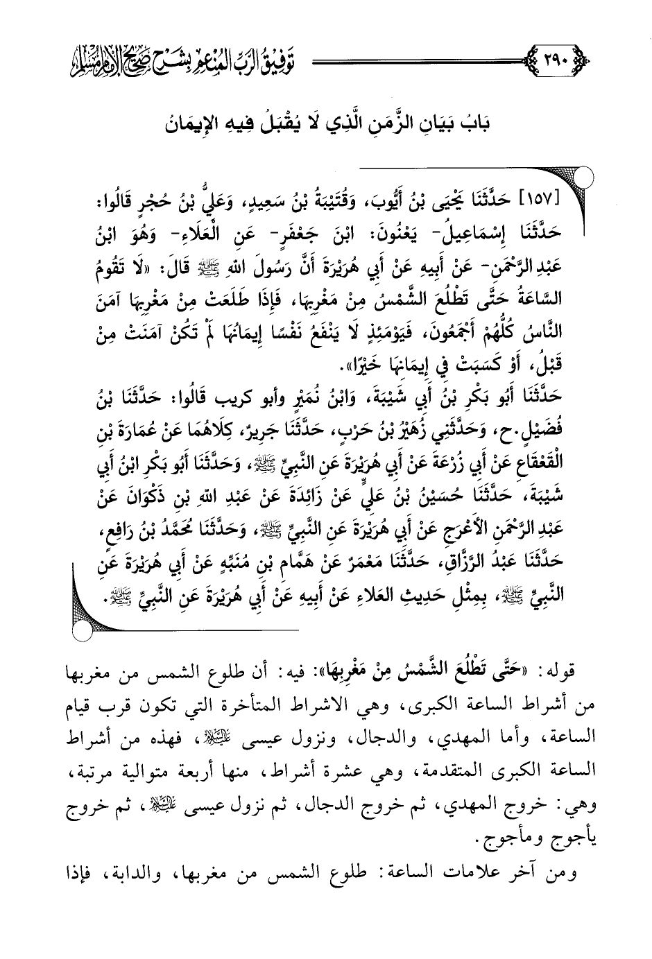 [١٥٧] حَدَّثَنَا يَحْيَى بْنُ أَيُّوبَ، وَقُتَيْبَةُ بْنُ سَعِيدٍ، وَعَلِيُّ بْنُ حُجْرٍ قَالُوا: حَدَّثَنَا إِسْمَاعِيلُ- يَعْنُونَ: ابْنَ جَعْفَرٍ- عَنِ الْعَلَاءِ- وَهُوَ ابْنُ عَبْدِ الرَّحْمَنِ- عَنْ أَبِيهِ عَنْ أَبِي هُرَيْرَةَ أَنَّ رَسُولَ اللَّهِ صلى الله عليه وسلم قَالَ: ((لَا تَقُومُ السَّاعَةُ حَتَّى تَطْلُعَ الشَّمْسُ مِنْ مَغْرِبِهَا، فَإِذَا طَلَعَتْ مِنْ مَغْرِبِهَا آمَنَ النَّاسُ كُلُّهُمْ أَجْمَعُونَ، فَيَوْمَئِذٍ لَا يَنْفَعُ نَفْسًا إِيمَانُهَا لَمْ تَكُنْ آمَنَتْ مِنْ قَبْلُ، أَوْ كَسَبَتْ فِي إِيمَانِهَا خَيْرًا)).