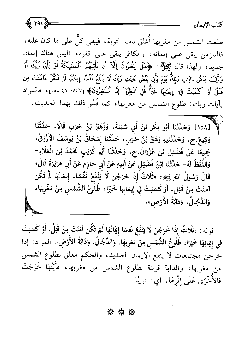 طلعت الشمس من مغربها أُغلق باب التوبة، فيبقى كلٌّ على ما كان عليه، فالمؤمن يبقى على إيمانه، والكافر يبقى على كفره، فليس هناك إيمان جديد؛ ولهذا قال سبحانه وتعالى: {هَلْ يَنْظُرُونَ إِلَّا أَنْ تَأْتِيَهُمُ الْمَلَائِكَةُ أَوْ يَأْتِيَ رَبُّكَ أَوْ يَأْتِيَ بَعْضُ آيَاتِ رَبِّكَ يَوْمَ يَأْتِي بَعْضُ آيَاتِ رَبِّكَ لَا يَنْفَعُ نَفْسًا إِيمَانُهَا لَمْ تَكُنْ آمَنَتْ مِنْ قَبْلُ أَوْ كَسَبَتْ فِي إِيمَانِهَا خَيْرًا قُلِ انْتَظِرُوا إِنَّا مُنْتَظِرُونَ}، فالمراد بآيات ربك: طلوع الشمس من مغربها، كما فُسِّر ذلك بهذا الحديث.