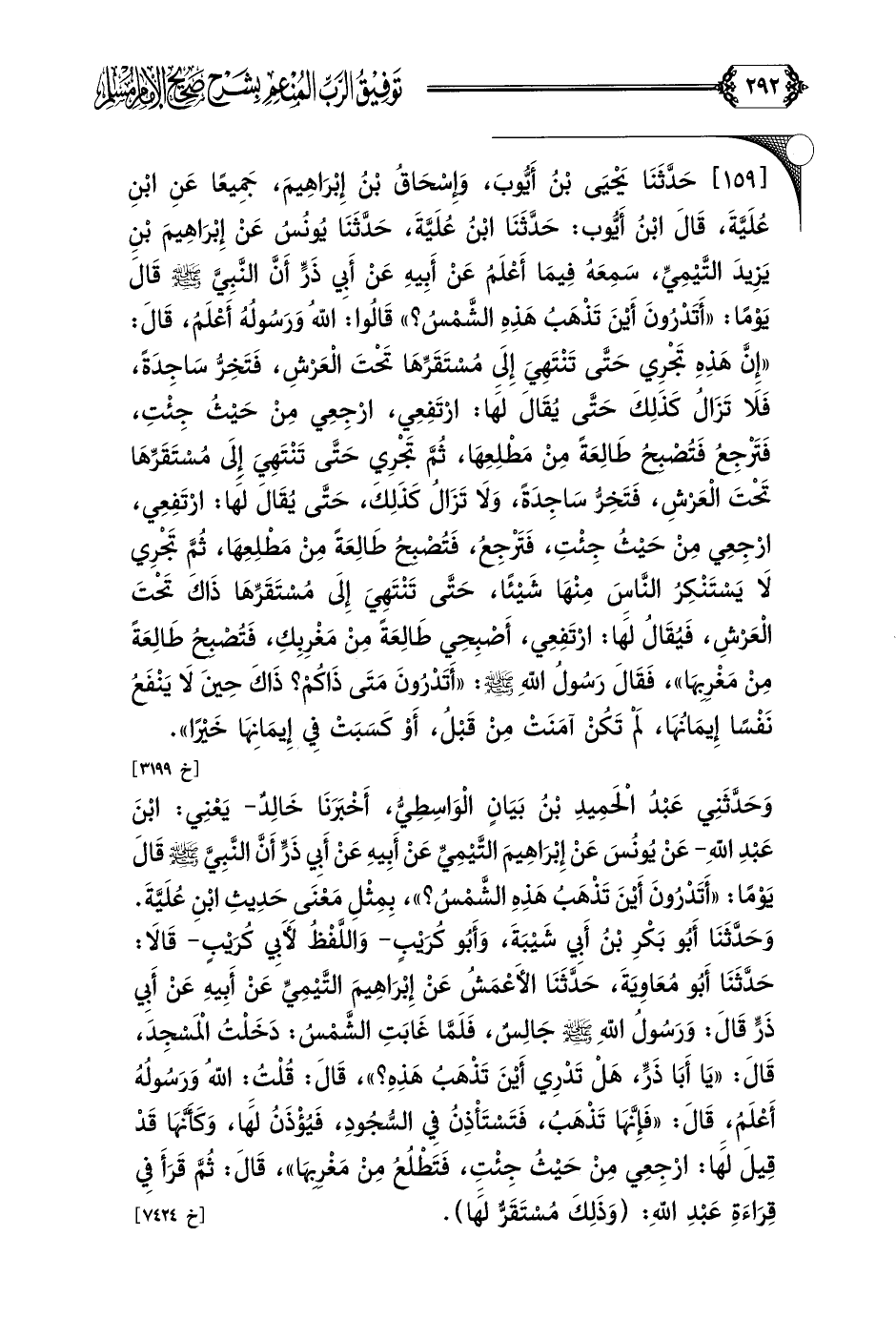 [١٥٩] حَدَّثَنَا يَحْيَى بْنُ أَيُّوبَ، وَإِسْحَاقُ بْنُ إِبْرَاهِيمَ، جَمِيعًا عَنِ ابْنِ عُلَيَّةَ، قَالَ ابْنُ أَيُّوب: حَدَّثَنَا ابْنُ عُلَيَّةَ، حَدَّثَنَا يُونُسُ عَنْ إِبْرَاهِيمَ بْنِ يَزِيدَ التَّيْمِيِّ، سَمِعَهُ فِيمَا أَعْلَمُ عَنْ أَبِيهِ عَنْ أَبِي ذَرٍّ أَنَّ النَّبِيَّ صلى الله عليه وسلم قَالَ يَوْمًا: ((أَتَدْرُونَ أَيْنَ تَذْهَبُ هَذِهِ الشَّمْسُ؟ )) قَالُوا: اللَّهُ وَرَسُولُهُ أَعْلَمُ، قَالَ: ((إِنَّ هَذِهِ تَجْرِي حَتَّى تَنْتَهِيَ إِلَى مُسْتَقَرِّهَا تَحْتَ الْعَرْشِ، فَتَخِرُّ سَاجِدَةً، فَلَا تَزَالُ كَذَلِكَ حَتَّى يُقَالَ لَهَا: ارْتَفِعِي، ارْجِعِي مِنْ حَيْثُ جِئْتِ، فَتَرْجِعُ فَتُصْبِحُ طَالِعَةً مِنْ مَطْلِعِهَا، ثُمَّ تَجْرِي حَتَّى تَنْتَهِيَ إِلَى مُسْتَقَرِّهَا تَحْتَ الْعَرْشِ، فَتَخِرُّ سَاجِدَةً، وَلَا تَزَالُ كَذَلِكَ، حَتَّى يُقَالَ لَهَا: ارْتَفِعِي، ارْجِعِي مِنْ حَيْثُ جِئْتِ، فَتَرْجِعُ، فَتُصْبِحُ طَالِعَةً مِنْ مَطْلِعِهَا، ثُمَّ تَجْرِي لَا يَسْتَنْكِرُ النَّاسَ مِنْهَا شَيْئًا، حَتَّى تَنْتَهِيَ إِلَى مُسْتَقَرِّهَا ذَاكَ تَحْتَ الْعَرْشِ، فَيُقَالُ لَهَا: ارْتَفِعِي، أَصْبِحِي طَالِعَةً مِنْ مَغْرِبِكِ، فَتُصْبِحُ طَالِعَةً مِنْ مَغْرِبِهَا))، فَقَالَ رَسُولُ اللَّهِ صلى الله عليه وسلم: ((أَتَدْرُونَ مَتَى ذَاكُمْ؟ ذَاكَ حِينَ لَا يَنْفَعُ نَفْسًا إِيمَانُهَا، لَمْ تَكُنْ آمَنَتْ مِنْ قَبْلُ، أَوْ كَسَبَتْ فِي إِيمَانِهَا خَيْرًا)). [خ ٣١٩٩]