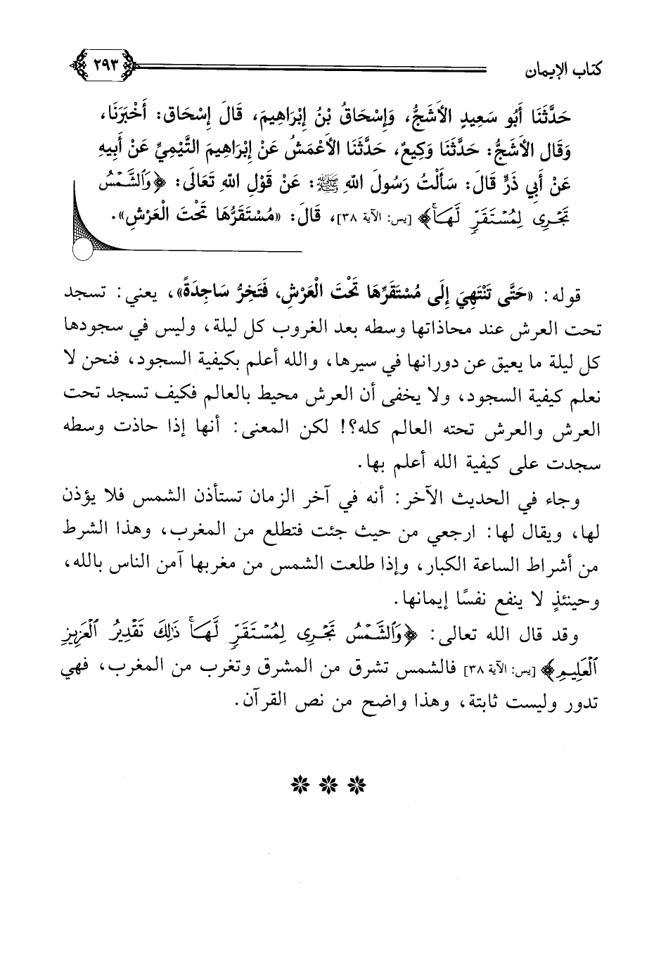 حَدَّثَنَا أَبُو سَعِيدٍ الأَشَجُّ، وَإِسْحَاقُ بْنُ إِبْرَاهِيمَ، قَالَ إِسْحَاق: أَخْبَرَنَا، وَقَال الأَشَجُّ: حَدَّثَنَا وَكِيعٌ، حَدَّثَنَا الأَعْمَشُ عَنْ إِبْرَاهِيمَ التَّيْمِيِّ عَنْ أَبِيهِ عَنْ أَبِي ذَرٍّ قَالَ: سَأَلْتُ رَسُولَ اللَّهِ صلى الله عليه وسلم: عَنْ قَوْلِ اللَّهِ تَعَالَى: {وَالشَّمْسُ تَجْرِي لِمُسْتَقَرٍّ لَهَا}، قَالَ: ((مُسْتَقَرُّهَا تَحْتَ الْعَرْشِ)).