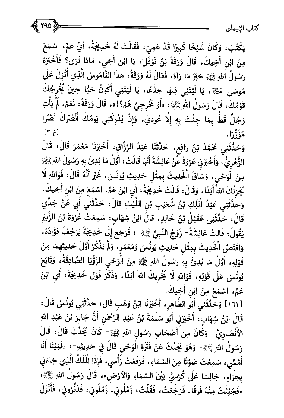يَكْتُبَ، وَكَانَ شَيْخًا كَبِيرًا قَدْ عَمِيَ، فَقَالَتْ لَهُ خَدِيجَةُ: أَيْ عَمِّ، اسْمَعْ مِنَ ابْنِ أَخِيكَ، قَالَ وَرَقَةُ بْنُ نَوْفَلٍ: يَا ابْنَ أَخِي، مَاذَا تَرَى؟ فَأَخْبَرَهُ رَسُولُ اللَّهِ صلى الله عليه وسلم خَبَرَ مَا رَأَىهُ، فَقَالَ لَهُ وَرَقَةُ: هَذَا النَّامُوسُ الَّذِي أُنْزِلَ عَلَى مُوسَى عَلَيْهِ السَّلامُ، يَا لَيْتَنِي فِيهَا جَذَعًا، يَا لَيْتَنِي أَكُونُ حَيًّا حِينَ يُخْرِجُكَ قَوْمُكَ، قَالَ رَسُولُ اللهِ صلى الله عليه وسلم: ((أَوَ مُخْرِجِيَّ هُمْ؟ ! ))، قَالَ وَرَقَةُ: نَعَمْ، لَمْ يَأْتِ رَجُلٌ قَطُّ بِمَا جِئْتَ بِهِ إِلَّا عُودِيَ، وَإِنْ يُدْرِكْنِي يَوْمُكَ أَنْصُرْكَ نَصْرًا مُؤَزَّرًا. [خ ٣].