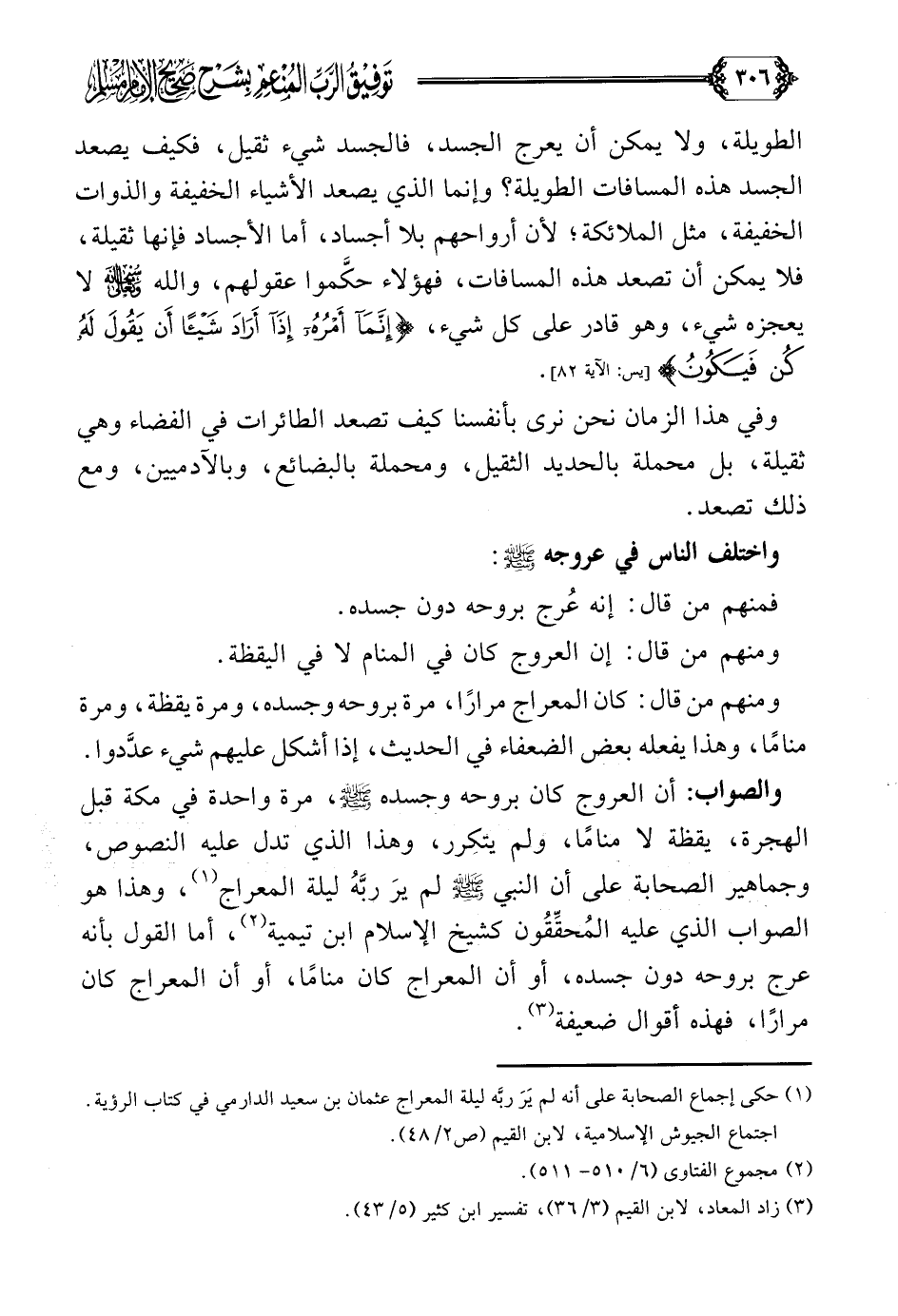 الطويلة، ولا يمكن أن يعرج الجسد، فالجسد شيء ثقيل، فكيف يصعد الجسد هذه المسافات الطويلة؟ وإنما الذي يصعد الأشياء الخفيفة والذوات الخفيفة، مثل الملائكة؛ لأن أرواحهم بلا أجساد، أما الأجساد فإنها ثقيلة، فلا يمكن أن تصعد هذه المسافات، فهؤلاء حكَّموا عقولهم، والله سبحانه وتعالى لا يعجزه شيء، وهو قادر على كل شيء، {إنما قوله إذا أراد شيئًا أن يقول له كن فيكون}.