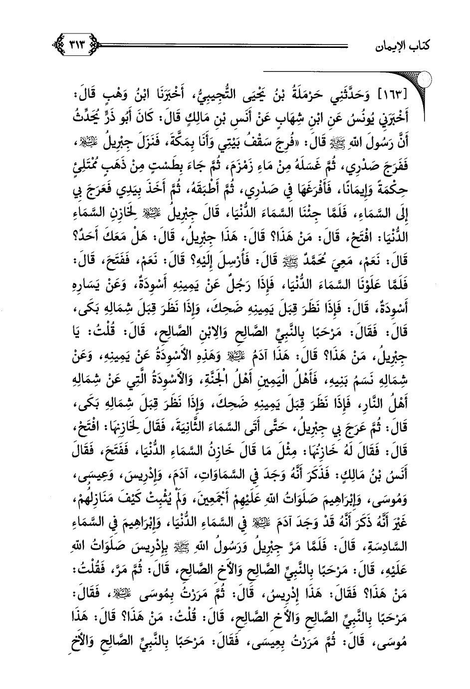 [١٦٣] وَحَدَّثَنِي حَرْمَلَةُ بْنُ يَحْيَى التُّجِيبِيُّ، أَخْبَرَنَا ابْنُ وَهْبٍ قَالَ: أَخْبَرَنِي يُونُسُ عَنِ ابْنِ شِهَابٍ عَنْ أَنَسِ بْنِ مَالِكٍ قَالَ: كَانَ أَبُو ذَرٍّ يُحَدِّثُ أَنَّ رَسُولَ اللَّهِ صلى الله عليه وسلم قَالَ: ((فُرِجَ سَقْفُ بَيْتِي وَأَنَا بِمَكَّةَ، فَنَزَلَ جِبْرِيلُ عَلَيْهِ السَّلامُ، فَفَرَجَ صَدْرِي، ثُمَّ غَسَلَهُ مِنْ مَاءِ زَمْزَمَ، ثُمَّ جَاءَ بِطَسْتٍ مِنْ ذَهَبٍ مُمْتَلِئٍ حِكْمَةً وَإِيمَانًا، فَأَفْرَغَهَا فِي صَدْرِي، ثُمَّ أَطْبَقَهُ، ثُمَّ أَخَذَ بِيَدِي فَعَرَجَ بِي إِلَى السَّمَاءِ، فَلَمَّا جِئْنَا السَّمَاءَ الدُّنْيَا، قَالَ جِبْرِيلُ عليه السلام لِخَازِنِ السَّمَاءِ الدُّنْيَا: افْتَحْ، قَالَ: مَنْ هَذَا؟ قَالَ: هَذَا جِبْرِيلُ، قَالَ: هَلْ مَعَكَ أَحَدٌ؟ قَالَ: نَعَمْ، مَعِيَ مُحَمَّدٌ صلى الله عليه وسلم قَالَ: فَأُرْسِلَ إِلَيْهِ؟ قَالَ: نَعَمْ، فَفَتَحَ، قَالَ: فَلَمَّا عَلَوْنَا السَّمَاءَ الدُّنْيَا، فَإِذَا رَجُلٌ عَنْ يَمِينِهِ أَسْوِدَةٌ، وَعَنْ يَسَارِهِ أَسْوِدَةٌ، قَالَ: فَإِذَا نَظَرَ قِبَلَ يَمِينِهِ ضَحِكَ، وَإِذَا نَظَرَ قِبَلَ شِمَالِهِ بَكَى، قَالَ: فَقَالَ: مَرْحَبًا بِالنَّبِيِّ الصَّالِحِ وَالِابْنِ الصَّالِحِ، قَالَ: قُلْتُ: يَا جِبْرِيلُ، مَنْ هَذَا؟ قَالَ: هَذَا آدَمُ عَلَيْهِ السَّلامُ وَهَذِهِ الأَسْوِدَةُ عَنْ يَمِينِهِ، وَعَنْ شِمَالِهِ نَسَمُ بَنِيهِ، فَأَهْلُ الْيَمِينِ أَهْلُ الْجَنَّةِ، وَالأَسْوِدَةُ الَّتِي عَنْ شِمَالِهِ أَهْلُ النَّارِ، فَإِذَا نَظَرَ قِبَلَ يَمِينِهِ ضَحِكَ، وَإِذَا نَظَرَ قِبَلَ شِمَالِهِ بَكَى، قَالَ: ثُمَّ عَرَجَ بِي جِبْرِيلُ، حَتَّى أَتَى السَّمَاءَ الثَّانِيَةَ، فَقَالَ لِخَازِنِهَا: افْتَحْ، قَالَ: فَقَالَ لَهُ خَازِنُهَا: مِثْلَ مَا قَالَ خَازِنُ السَّمَاءِ