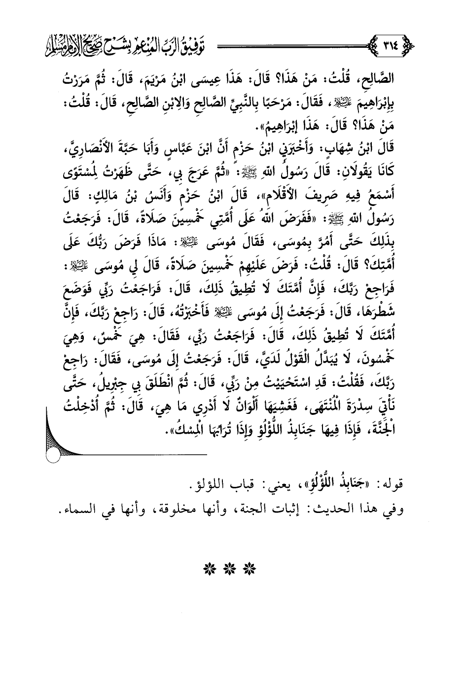 قَالَ ابْنُ شِهَابٍ: وَأَخْبَرَنِي ابْنُ حَزْمٍ أَنَّ ابْنَ عَبَّاسٍ وَأَبَا حَبَّةَ الأَنْصَارِيَّ، كَانَا يَقُولَانِ: قَالَ رَسُولُ اللَّهِ صلى الله عليه وسلم: ((ثُمَّ عَرَجَ بِي، حَتَّى ظَهَرْتُ لِمُسْتَوًى أَسْمَعُ فِيهِ صَرِيفَ الأَقْلَامِ))، قَالَ ابْنُ حَزْمٍ وَأَنَسُ بْنُ مَالِكٍ: قَالَ رَسُولُ اللَّهِ صلى الله عليه وسلم: ((فَفَرَضَ اللَّهُ عَلَى أُمَّتِي خَمْسِينَ صَلَاةً، قَالَ: فَرَجَعْتُ بِذَلِكَ حَتَّى أَمُرَّ بِمُوسَى، فَقَالَ مُوسَى عليه السلام: مَاذَا فَرَضَ رَبُّكَ عَلَى أُمَّتِكَ؟ قَالَ: قُلْتُ: فَرَضَ عَلَيْهِمْ خَمْسِينَ صَلَاةً، قَالَ لِي مُوسَى عليه السلام: فَرَاجِعْ رَبَّكَ؛ فَإِنَّ أُمَّتَكَ لَا تُطِيقُ ذَلِكَ، قَالَ: فَرَاجَعْتُ رَبِّي فَوَضَعَ شَطْرَهَا، قَالَ: فَرَجَعْتُ إِلَى مُوسَى عليه السلام فَأَخْبَرْتُهُ، قَالَ: رَاجِعْ رَبَّكَ، فَإِنَّ أُمَّتَكَ لَا تُطِيقُ ذَلِكَ، قَالَ: فَرَاجَعْتُ رَبِّي، فَقَالَ: هِيَ خَمْسٌ، وَهِيَ خَمْسُونَ، لَا يُبَدَّلُ الْقَوْلُ لَدَيَّ، قَالَ: فَرَجَعْتُ إِلَى مُوسَى، فَقَالَ: رَاجِعْ رَبَّكَ، فَقُلْتُ: قَدِ اسْتَحْيَيْتُ مِنْ رَبِّي، قَالَ: ثُمَّ انْطَلَقَ بِي جِبْرِيلُ، حَتَّى نَأْتِيَ سِدْرَةَ الْمُنْتَهَى، فَغَشِيَهَا أَلْوَانٌ لَا أَدْرِي مَا هِيَ، قَالَ: ثُمَّ أُدْخِلْتُ الْجَنَّةَ، فَإِذَا فِيهَا جَنَابِذُ اللُّؤْلُؤِ وَإِذَا تُرَابُهَا الْمِسْكُ)).