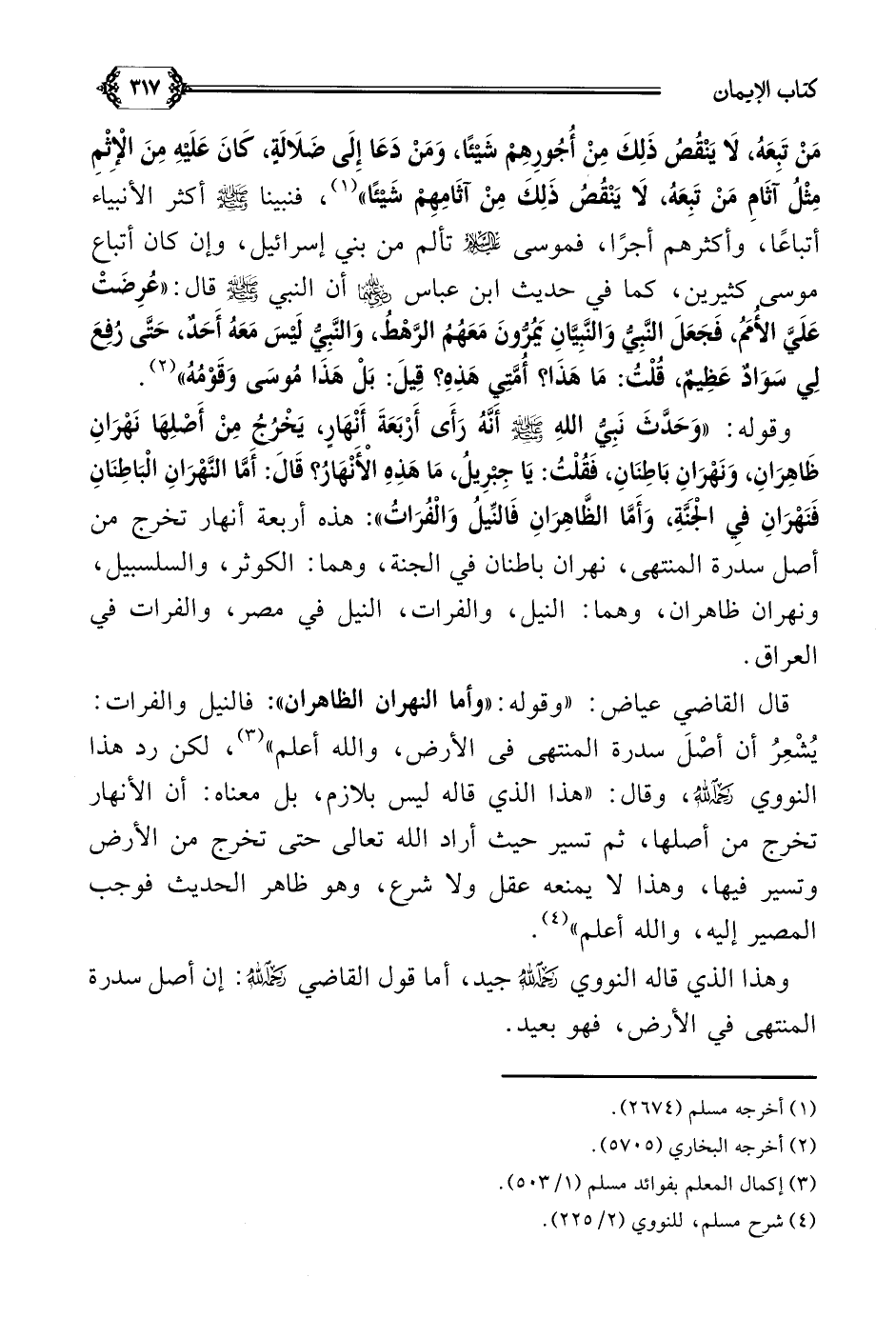 قال القاضي عياض: ((وقوله: ((وأما النهران الظاهران)): فالنيل والفرات: يُشْعِرُ أن أصْلَ سدرة المنتهى فى الأرض، والله أعلم)) (¬٣)، لكن رد هذا النووي رحمه الله، وقال: ((هذا الذي قاله ليس بلازم، بل معناه: أن الأنهار تخرج من أصلها ثم تسير حيث أراد الله تعالى حتى تخرج من الأرض وتسير فيها وهذا لا يمنعه عقل ولا شرع وهو ظاهر الحديث فوجب المصير إليه، والله أعلم)) (¬٤).