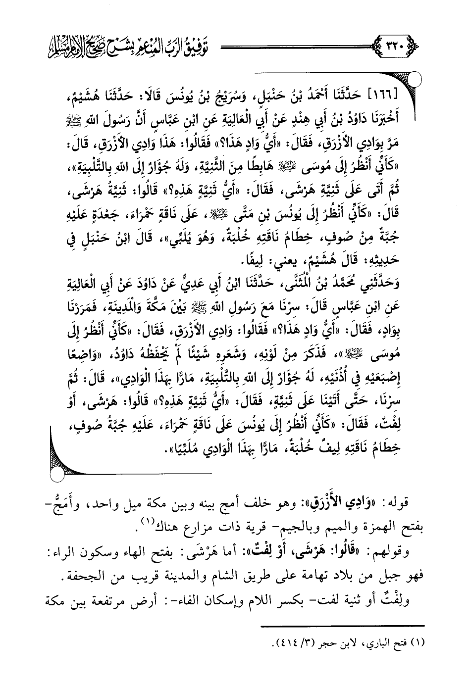 [١٦٦] حَدَّثَنَا أَحْمَدُ بْنُ حَنْبَلٍ، وَسُرَيْجُ بْنُ يُونُسَ قَالَا: حَدَّثَنَا هُشَيْمٌ، أَخْبَرَنَا دَاوُدُ بْنُ أَبِي هِنْدٍ عَنْ أَبِي الْعَالِيَةِ عَنِ ابْنِ عَبَّاسٍ أَنَّ رَسُولَ اللَّهِ صلى الله عليه وسلم مَرَّ بِوَادِي الأَزْرَقِ، فَقَالَ: ((أَيُّ وَادٍ هَذَا؟ )) فَقَالُوا: هَذَا وَادِي الأَزْرَقِ، قَالَ: ((كَأَنِّي أَنْظُرُ إِلَى مُوسَى عليه السلام هَابِطًا مِنَ الثَّنِيَّةِ، وَلَهُ جُؤَارٌ إِلَى اللَّهِ بِالتَّلْبِيَةِ))، ثُمَّ أَتَى عَلَى ثَنِيَّةِ هَرْشَى، فَقَالَ: ((أَيُّ ثَنِيَّةٍ هَذِهِ؟ )) قَالُوا: ثَنِيَّةُ هَرْشَى، قَالَ: ((كَأَنِّي أَنْظُرُ إِلَى يُونُسَ بْنِ مَتَّى عليه السلام، عَلَى نَاقَةٍ حَمْرَاءَ، جَعْدَةٍ عَلَيْهِ جُبَّةٌ مِنْ صُوفٍ، خِطَامُ نَاقَتِهِ خُلْبَةٌ، وَهُوَ يُلَبِّي))، قَالَ ابْنُ حَنْبَلٍ فِي حَدِيثِهِ: قَالَ هُشَيْمٌ، يعني: لِيفًا.