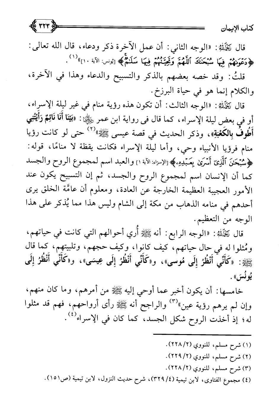 قال رحمه الله: ((الوجه الرابع: أنه صلى الله عليه وسلم أُري أحوالهم التي كانت في حياتهم، ومُثلوا له في حال حياتهم، كيف كانوا، وكيف حجهم، وتلبيتهم، كما قال صلى الله عليه وسلم: ((كَأَنِّي أَنْظُرُ إِلَى مُوسى))، و ((كَأَنِّي أَنْظُرُ إِلَى عِيسَى))، و ((كَأَنِّي أَنْظُرُ إِلَى يُونُسَ)).
