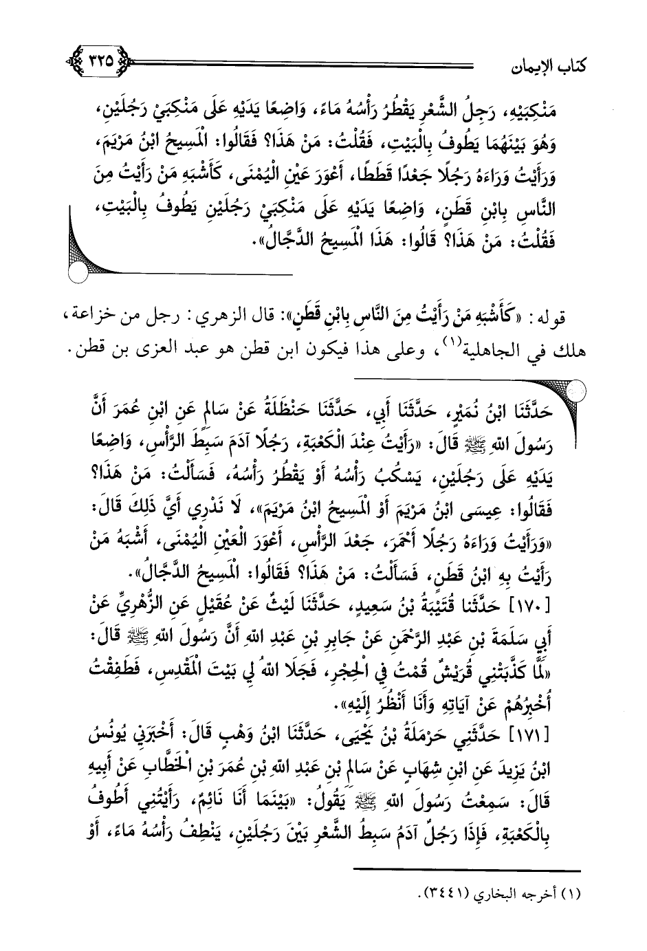 [١٧١] حَدَّثَنِي حَرْمَلَةُ بْنُ يَحْيَى، حَدَّثَنَا ابْنُ وَهْبٍ قَالَ: أَخْبَرَنِي يُونُسُ بْنُ يَزِيدَ عَنِ ابْنِ شِهَابٍ عَنْ سَالِمِ بْنِ عَبْدِ اللَّهِ بْنِ عُمَرَ بْنِ الْخَطَّابِ عَنْ أَبِيهِ قَالَ: سَمِعْتُ رَسُولَ اللَّهِ صلى الله عليه وسلم يَقُولُ: ((بَيْنَمَا أَنَا نَائِمٌ، رَأَيْتُنِي أَطُوفُ بِالْكَعْبَةِ، فَإِذَا رَجُلٌ آدَمُ سَبِطُ الشَّعْرِ بَيْنَ رَجُلَيْنِ، يَنْطِفُ رَأْسُهُ مَاءً، أَوْ