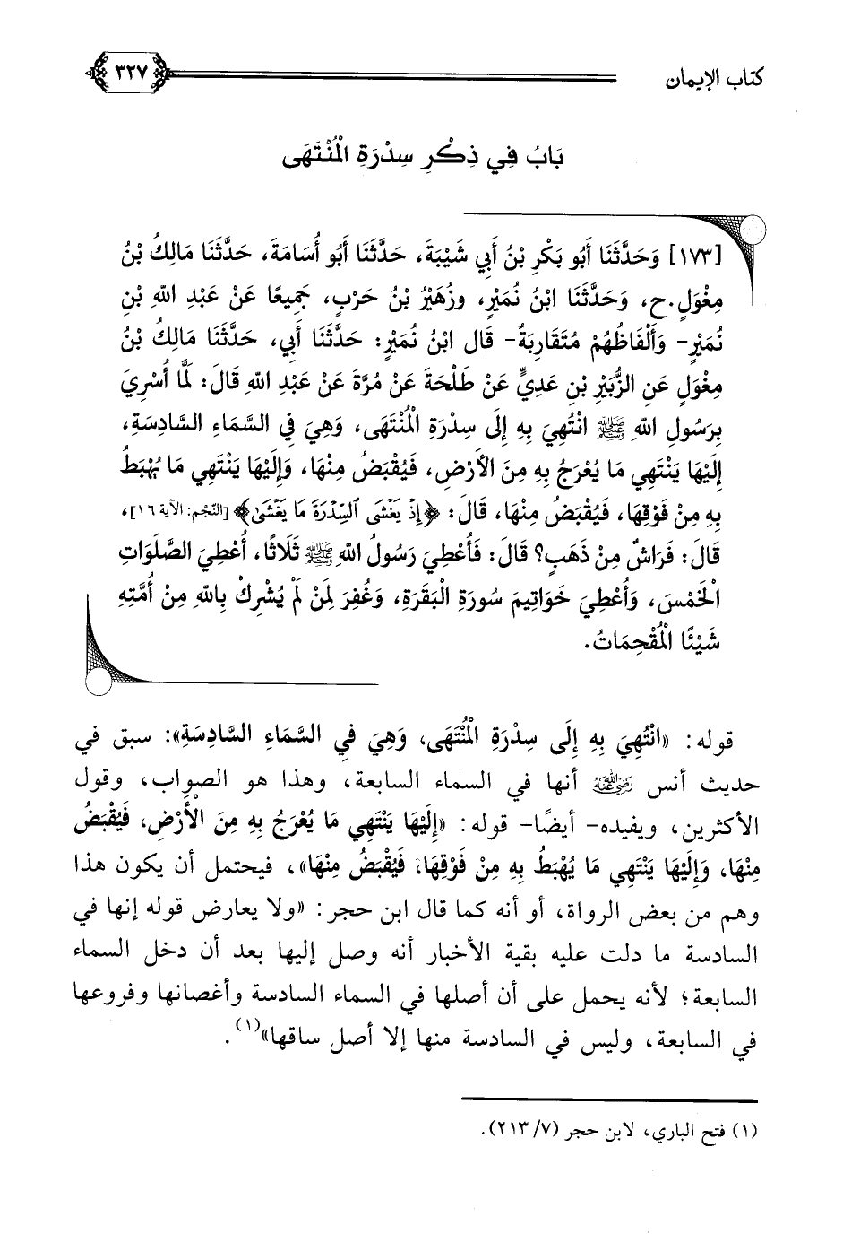 [١٧٣] وَحَدَّثَنَا أَبُو بَكْرِ بْنُ أَبِي شَيْبَةَ، حَدَّثَنَا أَبُو أُسَامَةَ، حَدَّثَنَا مَالِكُ بْنُ مِغْوَلٍ. ح، وَحَدَّثَنَا ابْنُ نُمَيْرٍ، وزُهَيْرُ بْنُ حَرْبٍ، جَمِيعًا عَنْ عَبْدِ اللَّهِ بْنِ نُمَيْرٍ- وَأَلْفَاظُهُمْ مُتَقَارِبَةٌ- قَال ابْنُ نُمَيْرٍ: حَدَّثَنَا أَبِي، حَدَّثَنَا مَالِكُ بْنُ مِغْوَلٍ عَنِ الزُّبَيْرِ بْنِ عَدِيٍّ عَنْ طَلْحَةَ عَنْ مُرَّةَ عَنْ عَبْدِ اللَّهِ قَالَ: لَمَّا أُسْرِيَ بِرَسُولِ اللَّهِ صلى الله عليه وسلم انْتُهِيَ بِهِ إِلَى سِدْرَةِ الْمُنْتَهَى، وَهِيَ فِي السَّمَاءِ السَّادِسَةِ، إِلَيْهَا يَنْتَهِي مَا يُعْرَجُ بِهِ مِنَ الأَرْضِ، فَيُقْبَضُ مِنْهَا، وَإِلَيْهَا يَنْتَهِي مَا يُهْبَطُ بِهِ مِنْ فَوْقِهَا، فَيُقْبَضُ مِنْهَا، قَالَ: {إِذْ يَغْشَى السِّدْرَةَ مَا يَغْشَى}، قَالَ: فَرَاشٌ مِنْ ذَهَبٍ؟ قَالَ: فَأُعْطِيَ رَسُولُ اللَّهِ صلى الله عليه وسلم ثَلَاثًا، أُعْطِيَ الصَّلَوَاتِ الْخَمْسَ، وَأُعْطِيَ خَوَاتِيمَ سُورَةِ الْبَقَرَةِ، وَغُفِرَ لِمَنْ لَمْ يُشْرِكْ بِاللَّهِ مِنْ أُمَّتِهِ شَيْئًا الْمُقْحِمَاتُ.