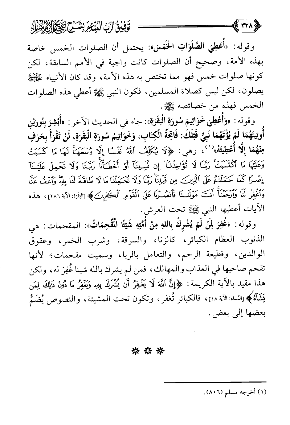 وقوله: ((وَأُعْطِيَ خَوَاتِيمَ سُورَةِ الْبَقَرَةِ)) جاء في الحديث الآخر ((أَبْشِرْ بِنُورَيْنِ أُوتِيتَهُمَا لَمْ يُؤْتَهُمَا نَبِيٌّ قَبْلَكَ: فَاتِحَةُ الْكِتَابِ، وَخَوَاتِيمُ سُورَةِ الْبَقَرَةِ، لَنْ تَقْرَأَ بِحَرْفٍ مِنْهُمَا إِلَّا أُعْطِيتَهُ)) (¬١)، وهي: {لَا يُكَلِّفُ اللَّهُ نَفْسًا إِلَّا وُسْعَهَا لَهَا مَا كَسَبَتْ وَعَلَيْهَا مَا اكْتَسَبَتْ رَبَّنَا لَا تُؤَاخِذْنَا إِنْ نَسِينَا أَوْ أَخْطَأْنَا رَبَّنَا وَلَا تَحْمِلْ عَلَيْنَا إِصْرًا كَمَا حَمَلْتَهُ عَلَى الَّذِينَ مِنْ قَبْلِنَا رَبَّنَا وَلَا تُحَمِّلْنَا مَا لَا طَاقَةَ لَنَا بِهِ وَاعْفُ عَنَّا وَاغْفِرْ لَنَا وَارْحَمْنَا أَنْتَ مَوْلَانَا فَانْصُرْنَا عَلَى الْقَوْمِ الْكَافِرِينَ}، هذه الآيات أعطيها النبي صلى الله عليه وسلم تحت العرش.