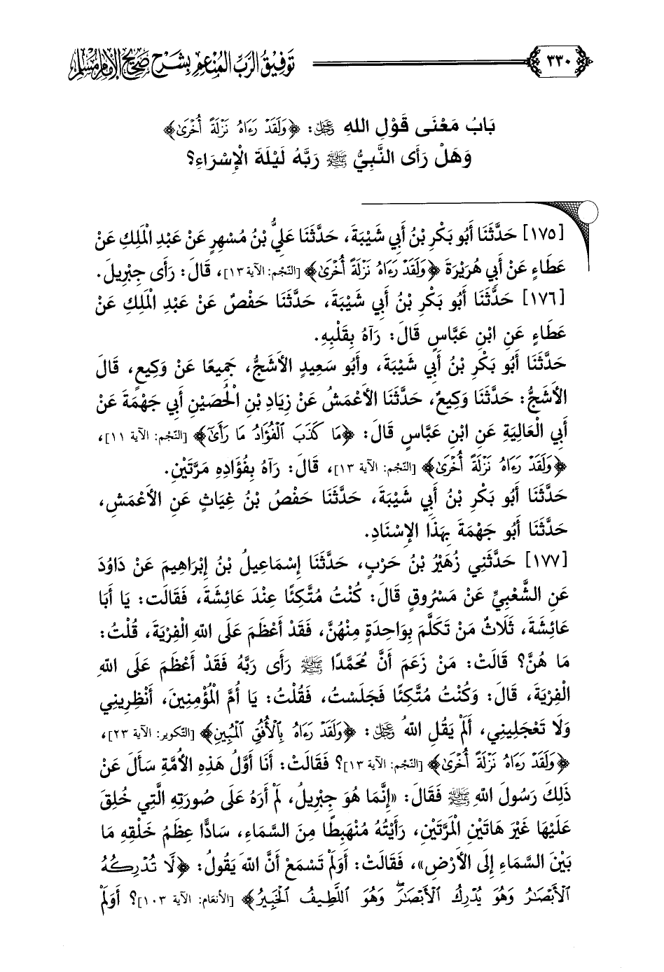 [١٧٧] حَدَّثَنِي زُهَيْرُ بْنُ حَرْبٍ، حَدَّثَنَا إِسْمَاعِيلُ بْنُ إِبْرَاهِيمَ عَنْ دَاوُدَ عَنِ الشَّعْبِيِّ عَنْ مَسْرُوقٍ قَالَ: كُنْتُ مُتَّكِئًا عِنْدَ عَائِشَةَ، فَقَالَت: يَا أَبَا عَائِشَةَ، ثَلَاثٌ مَنْ تَكَلَّمَ بِوَاحِدَةٍ مِنْهُنَّ، فَقَدْ أَعْظَمَ عَلَى اللَّهِ الْفِرْيَةَ، قُلْتُ: مَا هُنَّ؟ قَالَتْ: مَنْ زَعَمَ أَنَّ مُحَمَّدًا صلى الله عليه وسلم رَأَى رَبَّهُ فَقَدْ أَعْظَمَ عَلَى اللَّهِ الْفِرْيَةَ، قَالَ: وَكُنْتُ مُتَّكِئًا فَجَلَسْتُ، فَقُلْتُ: يَا أُمَّ الْمُؤْمِنِينَ، أَنْظِرِينِي وَلَا تَعْجَلِينِي، أَلَمْ يَقُلِ اللَّهُ عز وجل: {وَلَقَدْ رَأَىهُ بِالأُفُقِ الْمُبِينِ}، {وَلَقَدْ رَأَىهُ نَزْلَةً أُخْرَى}؟ فَقَالَتْ: أَنَا أَوَّلُ هَذِهِ الأُمَّةِ سَأَلَ عَنْ ذَلِكَ رَسُولَ اللَّهِ صلى الله عليه وسلم فَقَالَ: ((إِنَّمَا هُوَ جِبْرِيلُ، لَمْ أَرَهُ عَلَى صُورَتِهِ الَّتِي خُلِقَ عَلَيْهَا غَيْرَ هَاتَيْنِ الْمَرَّتَيْنِ، رَأَيْتُهُ مُنْهَبِطًا مِنَ السَّمَاءِ، سَادًّا عِظَمُ خَلْقِهِ مَا بَيْنَ السَّمَاءِ إِلَى الأَرْضِ))، فَقَالَتْ: أَوَلَمْ تَسْمَعْ أَنَّ اللَّهَ يَقُولُ: {لا تُدْرِكُهُ الأَبْصَارُ وَهُوَ يُدْرِكُ الأَبْصَارَ وَهُوَ اللَّطِيفُ الْخَبِيرُ}؟ أَوَلَمْ