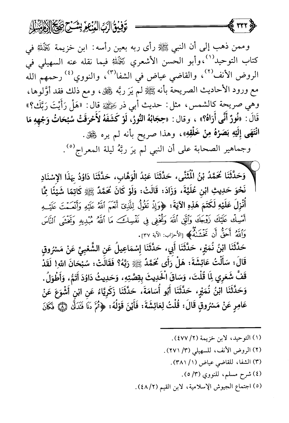 وممن ذهب إلى أن النبي صلى الله عليه وسلم رأى ربه بعين رأسه: ابن خزيمة رحمه الله في كتاب التوحيد (¬١)، وأبو الحسن الأشعري رحمه الله فيما نقله عنه السهيلي في الروض الأنف (¬٢)، والقاضي عياض في الشفا (¬٣)، والنووي (¬٤)، رحمهم الله، مع ورود الأحاديث الصريحة بأنه صلى الله عليه وسلم لم يَرَ ربَّه عز وجل، ومع ذلك فقد أوَّلوها، وهي صريحة كالشمس، مثل: حديث أبي ذر رضي الله عنه قال: ((هَلْ رَأَيْتَ رَبَّكَ؟ )) قَالَ: ((نُورٌ أَنَّى أَرَاهُ؟ ))، وقال: ((حِجَابُهُ النُّورُ، لَوْ كَشَفَهُ لَأَحْرَقَتْ سُبُحَاتُ وَجْهِهِ مَا انْتَهَى إِلَيْهِ بَصَرُهُ مِنْ خَلْقِهِ))، وهذا صريح بأنه لم يره عز وجل.