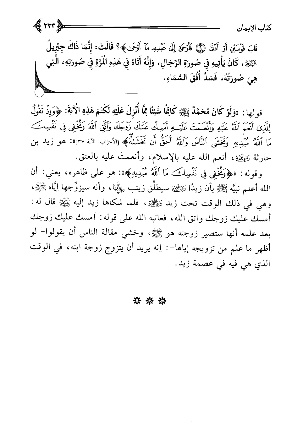 قولها: ((وَلَوْ كَانَ مُحَمَّدٌ صلى الله عليه وسلم كَاتِمًا شَيْئًا مِمَّا أُنْزِلَ عَلَيْهِ لَكَتَمَ هَذِهِ الْآيَةَ: {وَإِذْ تَقُولُ لِلَّذِي أَنْعَمَ اللَّهُ عَلَيْهِ وَأَنْعَمْتَ عَلَيْهِ أَمْسِكْ عَلَيْكَ زَوْجَكَ وَاتَّقِ اللَّهَ وَتُخْفِي فِي نَفْسِكَ مَا اللَّهُ مُبْدِيهِ وَتَخْشَى النَّاسَ وَاللَّهُ أَحَقُّ أَنْ تَخْشَاهُ})) هو زيد بن حارثة رضي الله عنه، أنعم الله عليه بالإسلام، وأنعمتَ عليه بالعتق.