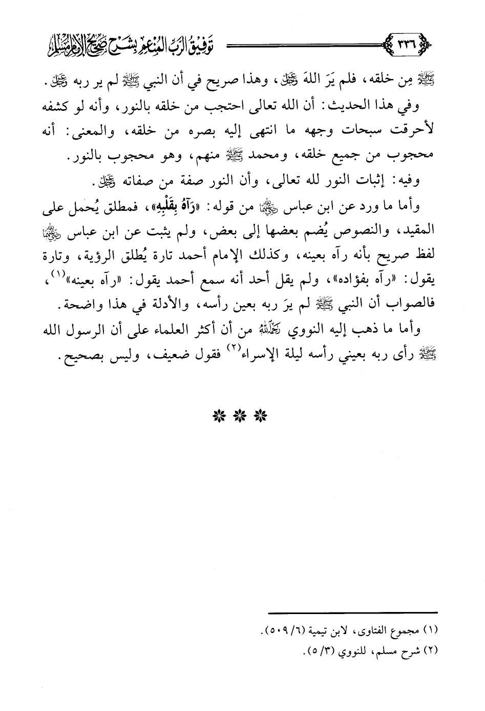 وأما ما ذهب إليه النووي رحمه الله من أن أكثر العلماء على أن الرسول الله صلى الله عليه وسلم رأى ربه بعيني رأسه ليلة الإسراء (¬٢)، فقول ضعيف وليس بصحيح.