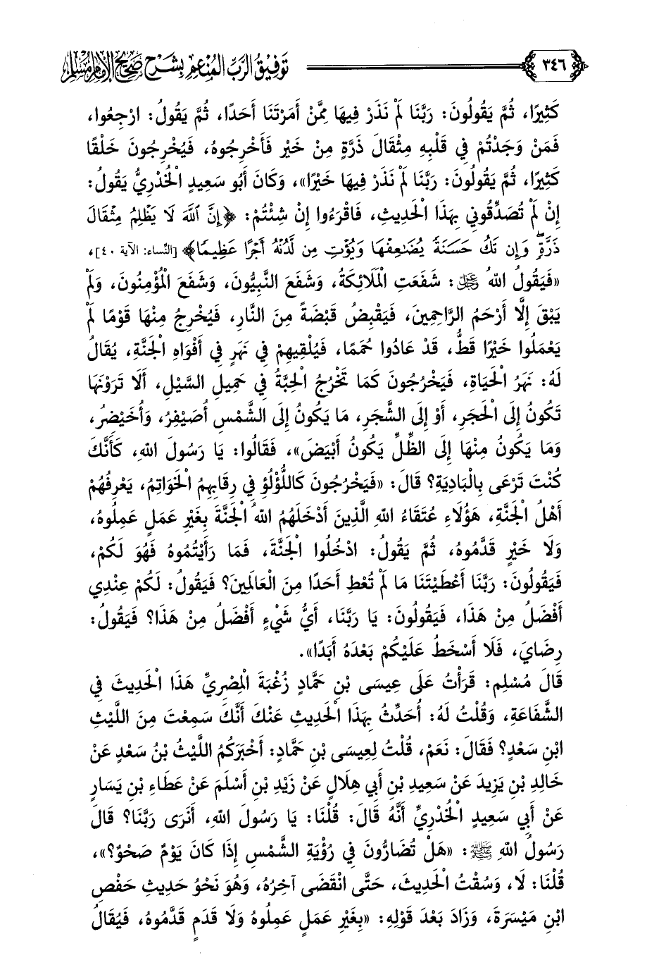 قَالَ مُسْلِم: قَرَأْتُ عَلَى عِيسَى بْنِ حَمَّادٍ زُغْبَةَ الْمِصْرِيِّ هَذَا الْحَدِيثَ فِي الشَّفَاعَةِ، وَقُلْتُ لَهُ: أُحَدِّثُ بِهَذَا الْحَدِيثِ عَنْكَ أَنَّكَ سَمِعْتَ مِنَ اللَّيْثِ بْنِ سَعْدٍ؟ فَقَالَ: نَعَمْ، قُلْتُ لِعِيسَى بْنِ حَمَّادٍ: أَخْبَرَكُمُ اللَّيْثُ بْنُ سَعْدٍ عَنْ خَالِدِ بْنِ يَزِيدَ عَنْ سَعِيدِ بْنِ أَبِي هِلَالٍ عَنْ زَيْدِ بْنِ أَسْلَمَ عَنْ عَطَاءِ بْنِ يَسَارٍ عَنْ أَبِي سَعِيدٍ الْخُدْرِيِّ أَنَّهُ قَالَ: قُلْنَا: يَا رَسُولَ اللَّهِ، أَنَرَى رَبَّنَا؟ قَالَ رَسُولُ اللَّهِ صلى الله عليه وسلم: ((هَلْ تُضَارُّونَ فِي رُؤْيَةِ الشَّمْسِ إِذَا كَانَ يَوْمٌ صَحْوٌ؟ ))، قُلْنَا: لَا، وَسُقْتُ الْحَدِيثَ، حَتَّى انْقَضَى آخِرُهُ، وَهُوَ نَحْوُ حَدِيثِ حَفْصِ بْنِ مَيْسَرَةَ، وَزَادَ بَعْدَ قَوْلِهِ: ((بِغَيْرِ عَمَلٍ عَمِلُوهُ وَلَا قَدَمٍ قَدَّمُوهُ، فَيُقَالُ