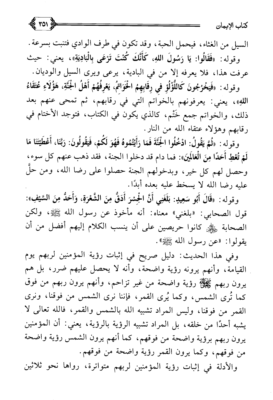 وهذا الحديث فيه: دليل صريح في إثبات رؤية المؤمنين لربهم يوم القيامة، وأنهم يرونه رؤية واضحة، وأنه لا يحصل عليهم ضرر، بل هم يرون ربهم سبحانه وتعالى رؤية واضحة من غير تزاحم، وأنهم يرون ربهم من فوق كما تُرى الشمس، وكما يُرى القمر، فإننا نرى الشمس من فوقنا، ونرى القمر من فوقنا، وليس المراد تشبيه الله بالشمس والقمر، فالله تعالى لا يشبه أحدًا من خلقه، بل المراد تشبيه الرؤية بالرؤية، يعني: أن المؤمنين يرون ربهم برؤية واضحة من فوقهم، كما أنهم يرون الشمس رؤية واضحة من فوقهم، وكما يرون القمر رؤية واضحة من فوقهم.