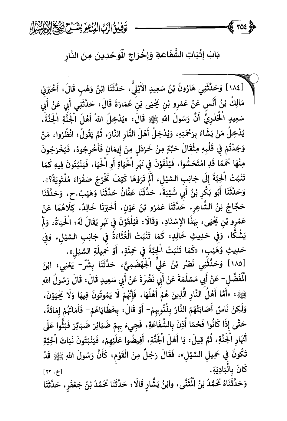 [١٨٤] وَحَدَّثَنِي هَارُونُ بْنُ سَعِيدٍ الأَيْلِيُّ، حَدَّثَنَا ابْنُ وَهْبٍ قَالَ: أَخْبَرَنِي مَالِكُ بْنُ أَنَسٍ عَنْ عَمْرِو بْنِ يَحْيَى بْنِ عُمَارَةَ قَالَ: حَدَّثَنِي أَبِي عَنْ أَبِي سَعِيدٍ الْخُدْرِيِّ أَنَّ رَسُولَ اللَّهِ صلى الله عليه وسلم قَالَ: ((يُدْخِلُ اللَّهُ أَهْلَ الْجَنَّةِ الْجَنَّةَ، يُدْخِلُ مَنْ يَشَاءُ بِرَحْمَتِهِ، وَيُدْخِلُ أَهْلَ النَّارِ النَّارَ، ثُمَّ يَقُولُ: انْظُرُوا، مَنْ وَجَدْتُمْ فِي قَلْبِهِ مِثْقَالَ حَبَّةٍ مِنْ خَرْدَلٍ مِنَ إِيمَانٍ فَأَخْرِجُوهُ، فَيُخْرَجُونَ مِنْهَا حُمَمًا قَدِ امْتَحَشُوا، فَيُلْقَوْنَ فِي نَهَرِ الْحَيَاةِ أَوِ الْحَيَا، فَيَنْبُتُونَ فِيهِ كَمَا تَنْبُتُ الْحِبَّةُ إِلَى جَانِبِ السَّيْلِ، أَلَمْ تَرَوْهَا كَيْفَ تَخْرُجُ صَفْرَاءَ مُلْتَوِيَةً؟ )).