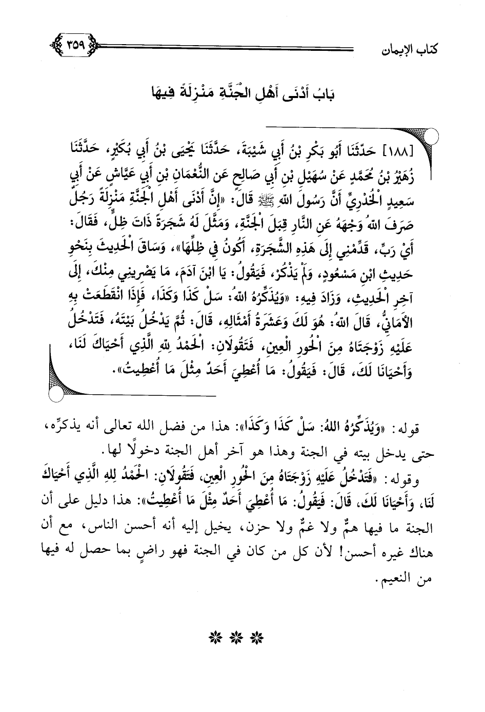 [١٨٨] حَدّثَنَا أَبُو بَكْرِ بْنُ أَبِي شَيْبَةَ، حَدَّثَنَا يَحْيَى بْنُ أَبِي بُكَيْرٍ، حَدَّثَنَا زُهَيْرُ بْنُ مُحَمَّدٍ عَنْ سُهَيْلِ بْنِ أَبِي صَالِحٍ عَن النُّعْمَانِ بْنِ أَبِي عَيَّاشٍ عَنْ أَبِي سَعِيدٍ الْخُدْرِيِّ أَنَّ رَسُولَ اللَّهِ صلى الله عليه وسلم قَالَ: ((إِنَّ أَدْنَى أَهْلِ الْجَنَّةِ مَنْزِلَةً رَجُلٌ صَرَفَ اللَّهُ وَجْهَهُ عَنِ النَّارِ قِبَلَ الْجَنَّةِ، وَمَثَّلَ لَهُ شَجَرَةً ذَاتَ ظِلٍّ، فَقَالَ: أَيْ رَبِّ، قَدِّمْنِي إِلَى هَذِهِ الشَّجَرَةِ، أَكُونُ فِي ظِلِّهَا))، وَسَاقَ الْحَدِيثَ بِنَحْوِ حَدِيثِ ابْنِ مَسْعُودٍ، وَلَمْ يَذْكُرْ، فَيَقُولُ: يَا ابْنَ آدَمَ، مَا يَصْرِينِي مِنْكَ، إِلَى آخِرِ الْحَدِيثِ، وَزَادَ فِيهِ: ((وَيُذَكِّرُهُ اللَّهُ: سَلْ كَذَا وَكَذَا، فَإِذَا انْقَطَعَتْ بِهِ الأَمَانِيُّ، قَالَ اللَّهُ: هُوَ لَكَ وَعَشَرَةُ أَمْثَالِهِ، قَالَ: ثُمَّ يَدْخُلُ بَيْتَهُ، فَتَدْخُلُ عَلَيْهِ زَوْجَتَاهُ مِنَ الْحُورِ الْعِينِ، فَتَقُولَانِ: الْحَمْدُ لِلَّهِ الَّذِي أَحْيَاكَ لَنَا، وَأَحْيَانَا لَكَ، قَالَ: فَيَقُولُ: مَا أُعْطِيَ أَحَدٌ مِثْلَ مَا أُعْطِيتُ)).