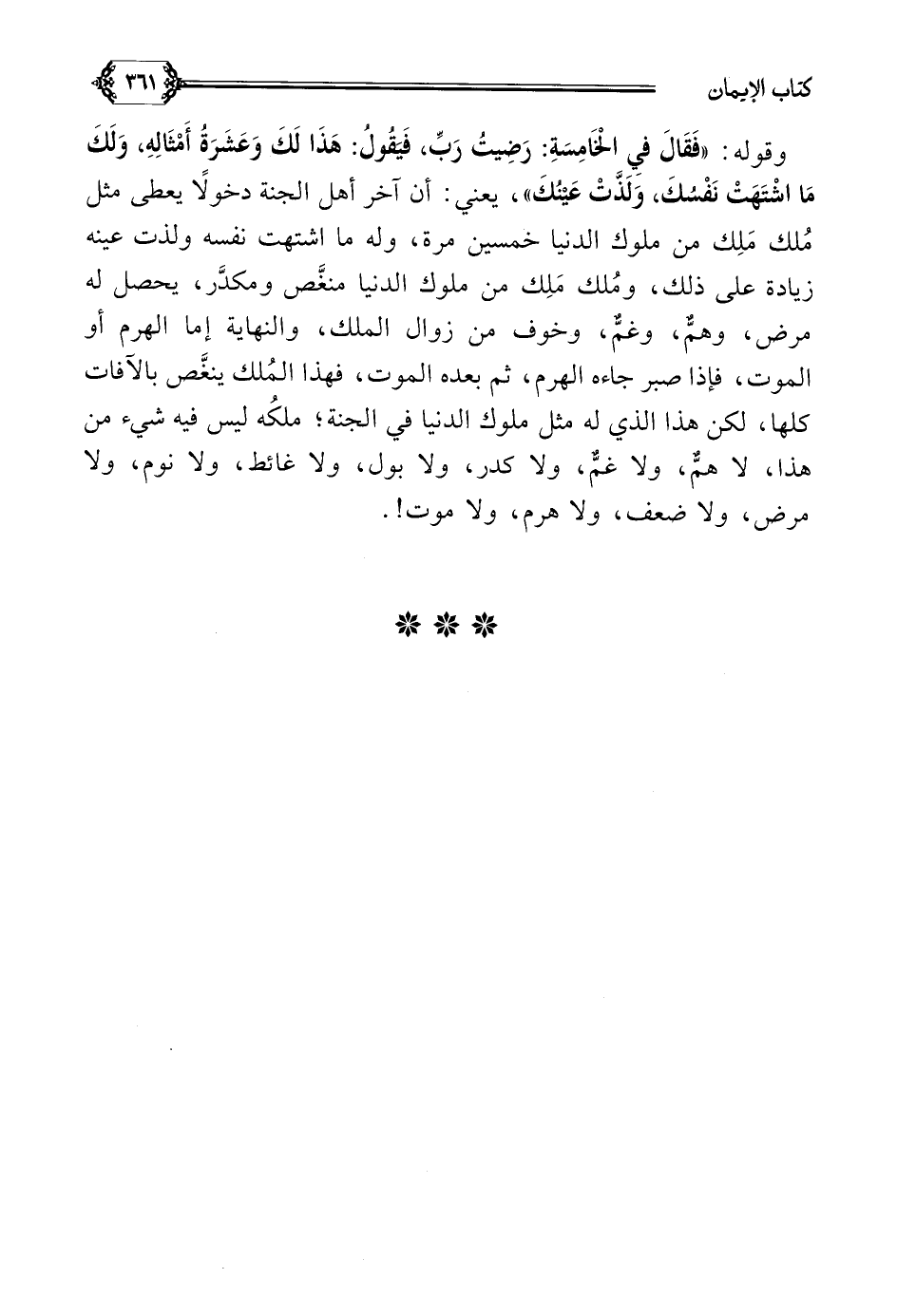 وقوله: ((فَقَالَ فِي الْخَامِسَةِ: رَضِيتُ رَبِّ، فَيَقُولُ: هَذَا لَكَ وَعَشَرَةُ أَمْثَالِهِ، وَلَكَ مَا اشْتَهَتْ نَفْسُكَ، وَلَذَّتْ عَيْنُكَ))، يعني: آخر أهل الجنة دخولًا يعطى مثل مُلك مَلِك من ملوك الدنيا خمسين مرة، وله ما اشتهت نفسه ولذت عينه زيادة على ذلك، ومُلك مَلِك من ملوك الدنيا منغَّص ومكدَّر، يحصل له مرض، وهم، وغم، وخوف من زوال الملك، والنهاية إما الهرم أو الموت، فإذا صبر جاءه الهرم، ثم بعده الموت، فهذا المُلك ينغَّص بالآفات كلها، لكن هذا الذي له مثل ملوك الدنيا في الجنة؛ ملكُه ليس فيه شيء من هذا، لا هم، ولا غم، ولا كدر، ولا بول، ولا غائط، ولا نوم، ولا مرض، ولا ضعف، ولا هرم، ولا موت.