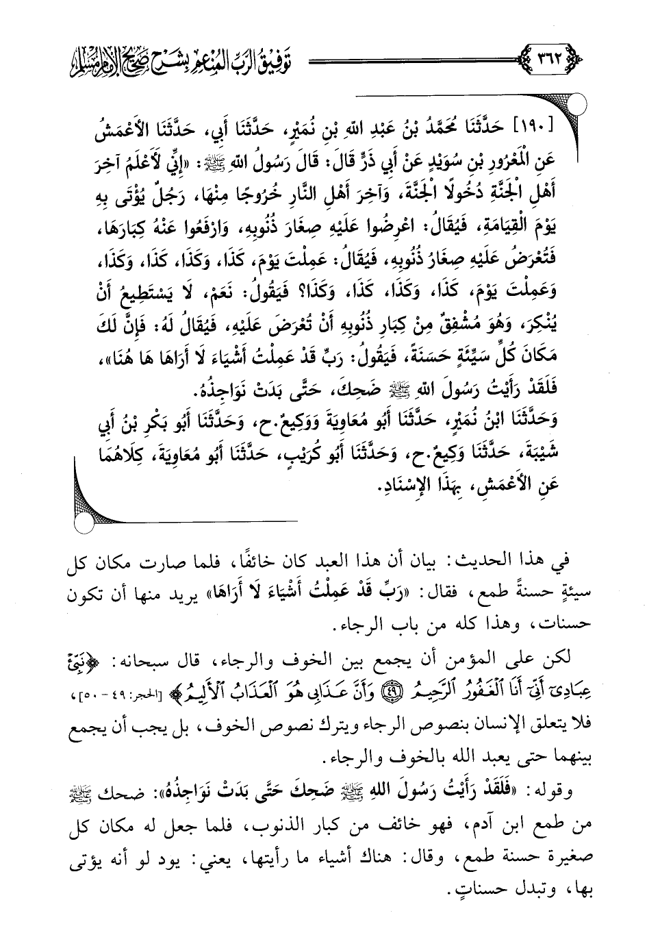 [١٩٠] حَدَّثَنَا مُحَمَّدُ بْنُ عَبْدِ اللَّهِ بْنِ نُمَيْرٍ، حَدَّثَنَا أَبِي، حَدَّثَنَا الأَعْمَشُ عَنِ الْمَعْرُورِ بْنِ سُوَيْدٍ عَنْ أَبِي ذَرٍّ قَالَ: قَالَ رَسُولُ اللَّهِ صلى الله عليه وسلم: ((إِنِّي لَأَعْلَمُ آخِرَ أَهْلِ الْجَنَّةِ دُخُولًا الْجَنَّةَ، وَآخِرَ أَهْلِ النَّارِ خُرُوجًا مِنْهَا، رَجُلٌ يُؤْتَى بِهِ يَوْمَ الْقِيَامَةِ، فَيُقَالُ: اعْرِضُوا عَلَيْهِ صِغَارَ ذُنُوبِهِ، وَارْفَعُوا عَنْهُ كِبَارَهَا، فَتُعْرَضُ عَلَيْهِ صِغَارُ ذُنُوبِهِ، فَيُقَالُ: عَمِلْتَ يَوْمَ، كَذَا، وَكَذَا، كَذَا، وَكَذَا، وَعَمِلْتَ يَوْمَ، كَذَا، وَكَذَا، كَذَا، وَكَذَا؟ فَيَقُولُ: نَعَمْ، لَا يَسْتَطِيعُ أَنْ يُنْكِرَ، وَهُوَ مُشْفِقٌ مِنْ كِبَارِ ذُنُوبِهِ أَنْ تُعْرَضَ عَلَيْهِ، فَيُقَالُ لَهُ: فَإِنَّ لَكَ مَكَانَ كُلِّ سَيِّئَةٍ حَسَنَةً، فَيَقُولُ: رَبِّ قَدْ عَمِلْتُ أَشْيَاءَ لَا أَرَاهَا هَا هُنَا))، فَلَقَدْ رَأَيْتُ رَسُولَ اللَّهِ صلى الله عليه وسلم ضَحِكَ، حَتَّى بَدَتْ نَوَاجِذُهُ.