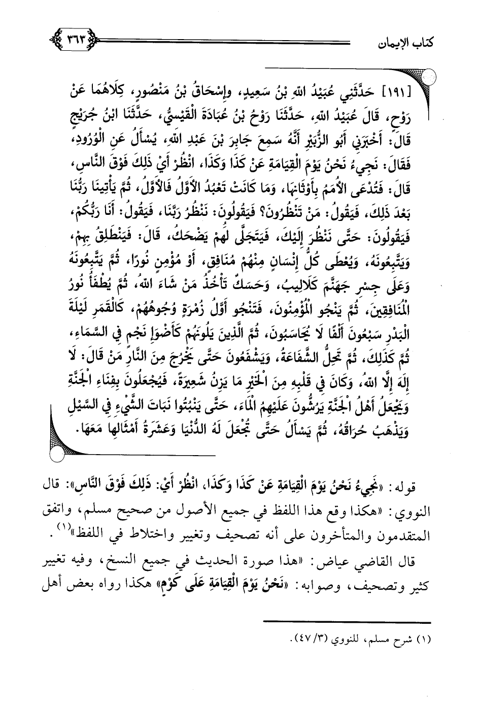[١٩١] حَدَّثَنِي عُبَيْدُ اللَّهِ بْنُ سَعِيدٍ، وإِسْحَاقُ بْنُ مَنْصُورٍ، كِلَاهُمَا عَنْ رَوْحٍ، قَالَ عُبَيْدُ اللَّهِ، حَدَّثَنَا رَوْحُ بْنُ عُبَادَةَ الْقَيْسِيُّ، حَدَّثَنَا ابْنُ جُرَيْجٍ قَالَ: أَخْبَرَنِي أَبُو الزُّبَيْرِ أَنَّهُ سَمِعَ جَابِرَ بْنَ عَبْدِ اللَّهِ، يُسْأَلُ عَنِ الْوُرُودِ، فَقَالَ: نَجِيءُ نَحْنُ يَوْمَ الْقِيَامَةِ عَنْ كَذَا وَكَذَا، انْظُرْ أَيْ ذَلِكَ فَوْقَ النَّاسِ، قَالَ: فَتُدْعَى الأُمَمُ بِأَوْثَانِهَا، وَمَا كَانَتْ تَعْبُدُ الأَوَّلُ فَالأَوَّلُ، ثُمَّ يَأْتِينَا رَبُّنَا بَعْدَ ذَلِكَ، فَيَقُولُ: مَنْ تَنْظُرُونَ؟ فَيَقُولُونَ: نَنْظُرُ رَبَّنَا، فَيَقُولُ: أَنَا رَبُّكُمْ، فَيَقُولُونَ: حَتَّى نَنْظُرَ إِلَيْكَ، فَيَتَجَلَّى لَهُمْ يَضْحَكُ، قَالَ: فَيَنْطَلِقُ بِهِمْ، وَيَتَّبِعُونَهُ، وَيُعْطَى كُلُّ إِنْسَانٍ مِنْهُمْ مُنَافِقٍ، أَوْ مُؤْمِنٍ نُورًا، ثُمَّ يَتَّبِعُونَهُ وَعَلَى جِسْرِ جَهَنَّمَ كَلَالِيبُ، وَحَسَكٌ تَأْخُذُ مَنْ شَاءَ اللَّهُ، ثُمَّ يُطْفَأُ نُورُ الْمُنَافِقِينَ، ثُمَّ يَنْجُو الْمُؤْمِنُونَ، فَتَنْجُو أَوَّلُ زُمْرَةٍ وُجُوهُهُمْ، كَالْقَمَرِ لَيْلَةَ الْبَدْرِ سَبْعُونَ أَلْفًا لَا يُحَاسَبُونَ، ثُمَّ الَّذِينَ يَلُونَهُمْ كَأَضْوَإِ نَجْمٍ فِي السَّمَاءِ، ثُمَّ كَذَلِكَ، ثُمَّ تَحِلُّ الشَّفَاعَةُ، وَيَشْفَعُونَ حَتَّى يَخْرُجَ مِنَ النَّارِ مَنْ قَالَ: لَا إِلَهَ إِلَّا اللَّهُ، وَكَانَ فِي قَلْبِهِ مِنَ الْخَيْرِ مَا يَزِنُ شَعِيرَةً،