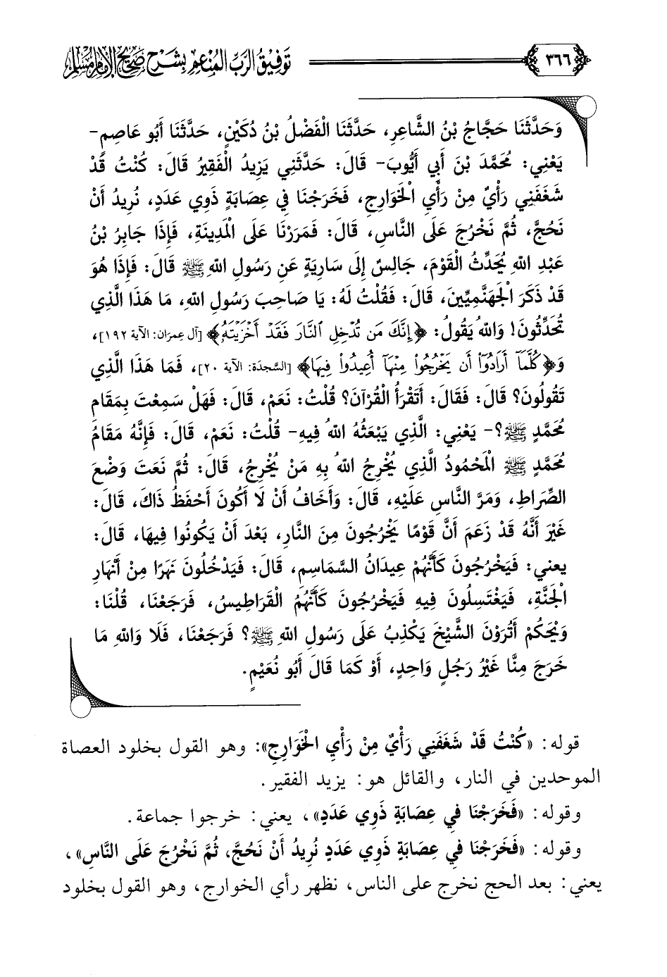 وَحَدَّثَنَا حَجَّاجُ بْنُ الشَّاعِرِ، حَدَّثَنَا الْفَضْلُ بْنُ دُكَيْنٍ، حَدَّثَنَا أَبُو عَاصِمٍ- يَعْنِي: مُحَمَّدَ بْنَ أَبِي أَيُّوبَ- قَالَ: حَدَّثَنِي يَزِيدُ الْفَقِيرُ قَالَ: كُنْتُ قَدْ شَغَفَنِي رَأْيٌ مِنْ رَأْيِ الْخَوَارِجِ، فَخَرَجْنَا فِي عِصَابَةٍ ذَوِي عَدَدٍ، نُرِيدُ أَنْ نَحُجَّ، ثُمَّ نَخْرُجَ عَلَى النَّاسِ، قَالَ: فَمَرَرْنَا عَلَى الْمَدِينَةِ، فَإِذَا جَابِرُ بْنُ عَبْدِ اللَّهِ يُحَدِّثُ الْقَوْمَ، جَالِسٌ إِلَى سَارِيَةٍ عَنِ رَسُولِ اللَّهِ صلى الله عليه وسلم قَالَ: فَإِذَا هُوَ قَدْ ذَكَرَ الْجَهَنَّمِيِّينَ، قَالَ: فَقُلْتُ لَهُ: يَا صَاحِبَ رَسُولِ اللَّهِ، مَا هَذَا الَّذِي تُحَدِّثُونَ! وَاللَّهُ يَقُولُ: {إِنَّكَ مَنْ تُدْخِلِ النَّارَ فَقَدْ أَخْزَيْتَهُ}، وَ {كُلَّمَا أَرَادُوا أَنْ يَخْرُجُوا مِنْهَا أُعِيدُوا فِيهَا}، فَمَا هَذَا الَّذِي تَقُولُونَ؟ قَالَ: فَقَالَ: أَتَقْرَأُ الْقُرْآنَ؟ قُلْتُ: نَعَمْ، قَالَ: فَهَلْ سَمِعْتَ بِمَقَامِ مُحَمَّدٍ صلى الله عليه وسلم؟ - يَعْنِي: الَّذِي يَبْعَثُهُ اللَّهُ فِيهِ- قُلْتُ: نَعَمْ، قَالَ: فَإِنَّهُ مَقَامُ مُحَمَّدٍ صلى الله عليه وسلم الْمَحْمُودُ الَّذِي يُخْرِجُ اللَّهُ بِهِ مَنْ يُخْرِجُ، قَالَ: ثُمَّ نَعَتَ وَضْعَ الصِّرَاطِ، وَمَرَّ النَّاسِ عَلَيْهِ، قَالَ: وَأَخَافُ أَنْ لَا أَكُونَ أَحْفَظُ ذَاكَ، قَالَ: غَيْرَ أَنَّهُ قَدْ زَعَمَ أَنَّ قَوْمًا يَخْرُجُونَ مِنَ النَّارِ، بَعْدَ أَنْ يَكُونُوا فِيهَا، قَالَ: يعني: فَيَخْرُجُونَ كَأَنَّهُمْ عِيدَانُ السَّمَاسِمِ، قَالَ: فَيَدْخُلُونَ نَهَرًا مِنْ أَنْهَارِ الْجَنَّةِ، فَيَغْتَسِلُونَ فِيهِ فَيَخْرُجُونَ كَأَنَّهُمُ الْقَرَاطِيسُ، فَرَجَعْنَا، قُلْنَا: وَيْحَكُمْ أَتُرَوْنَ الشَّيْخَ يَكْذِبُ عَلَى رَسُولِ اللَّهِ صلى الله عليه