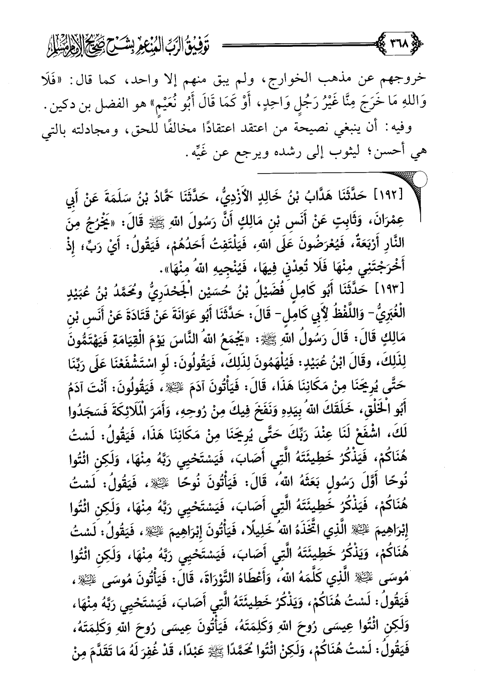 [١٩٣] حَدَّثَنَا أَبُو كَامِلٍ فُضَيْلُ بْنُ حُسَيْن الْجَحْدَرِيُّ ومُحَمَّدُ بْنُ عُبَيْدٍ الْغُبَرِيُّ- وَاللَّفْظُ لِأَبِي كَامِلٍ- قَالَ: حَدَّثَنَا أَبُو عَوَانَةَ عَنْ قَتَادَةَ عَنْ أَنَسِ بْنِ مَالِكٍ قَالَ: قَالَ رَسُولُ اللَّهِ صلى الله عليه وسلم: ((يَجْمَعُ اللَّهُ النَّاسَ يَوْمَ الْقِيَامَةِ فَيَهْتَمُّونَ لِذَلِكَ، وقَالَ ابْنُ عُبَيْدٍ: فَيُلْهَمُونَ لِذَلِكَ، فَيَقُولُونَ: لَوِ اسْتَشْفَعْنَا عَلَى رَبِّنَا حَتَّى يُرِيحَنَا مِنْ مَكَانِنَا هَذَا، قَالَ: فَيَأْتُونَ آدَمَ عَلَيْهِ السّلامُ، فَيَقُولُونَ: أَنْتَ آدَمُ أَبُو الْخَلْقِ، خَلَقَكَ اللَّهُ بِيَدِهِ وَنَفَخَ فِيكَ مِنْ رُوحِهِ، وَأَمَرَ الْمَلَائِكَةَ فَسَجَدُوا لَكَ، اشْفَعْ لَنَا عِنْدَ رَبِّكَ حَتَّى يُرِيحَنَا مِنْ مَكَانِنَا هَذَا، فَيَقُولُ: لَسْتُ هُنَاكُمْ، فَيَذْكُرُ خَطِيئَتَهُ الَّتِي أَصَابَ، فَيَسْتَحْيِي رَبَّهُ مِنْهَا، وَلَكِنِ ائْتُوا نُوحًا أَوَّلَ رَسُولٍ بَعَثَهُ اللَّهُ، قَالَ: فَيَأْتُونَ نُوحًا عَلَيْهِ السَّلامُ، فَيَقُولُ: لَسْتُ هُنَاكُمْ، فَيَذْكُرُ خَطِيئَتَهُ الَّتِي أَصَابَ، فَيَسْتَحْيِي رَبَّهُ مِنْهَا، وَلَكِنِ ائْتُوا إِبْرَاهِيمَ عَلَيْهِ السَّلامُ الَّذِي اتَّخَذَهُ اللَّهُ خَلِيلًا، فَيَأْتُونَ إِبْرَاهِيمَ عَلَيْهِ السّلامُ، فَيَقُولُ: لَسْتُ هُنَاكُمْ، وَيَذْكُرُ خَطِيئَتَهُ الَّتِي أَصَابَ، فَيَسْتَحْيِي رَبَّهُ مِنْهَا، وَلَكِنِ ائْتُوا مُوسَى عَلَيْهِ السَّلامُ الَّذِي كَلَّمَهُ اللَّهُ، وَأَعْطَاهُ التَّوْرَاةَ، قَالَ: فَيَأْتُونَ مُوسَى عَلَيْهِ السَّلامُ، فَيَقُولُ: لَسْتُ هُنَاكُمْ، وَيَذْكُرُ خَطِيئَتَهُ الَّتِي أَصَابَ، فَيَسْتَحْيِي رَبَّهُ مِنْهَا، وَلَكِنِ ائْتُوا عِيسَى رُوحَ اللَّهِ وَكَلِمَتَهُ، فَيَأْتُونَ عِيسَى رُوحَ اللَّهِ وَكَلِمَتَهُ،