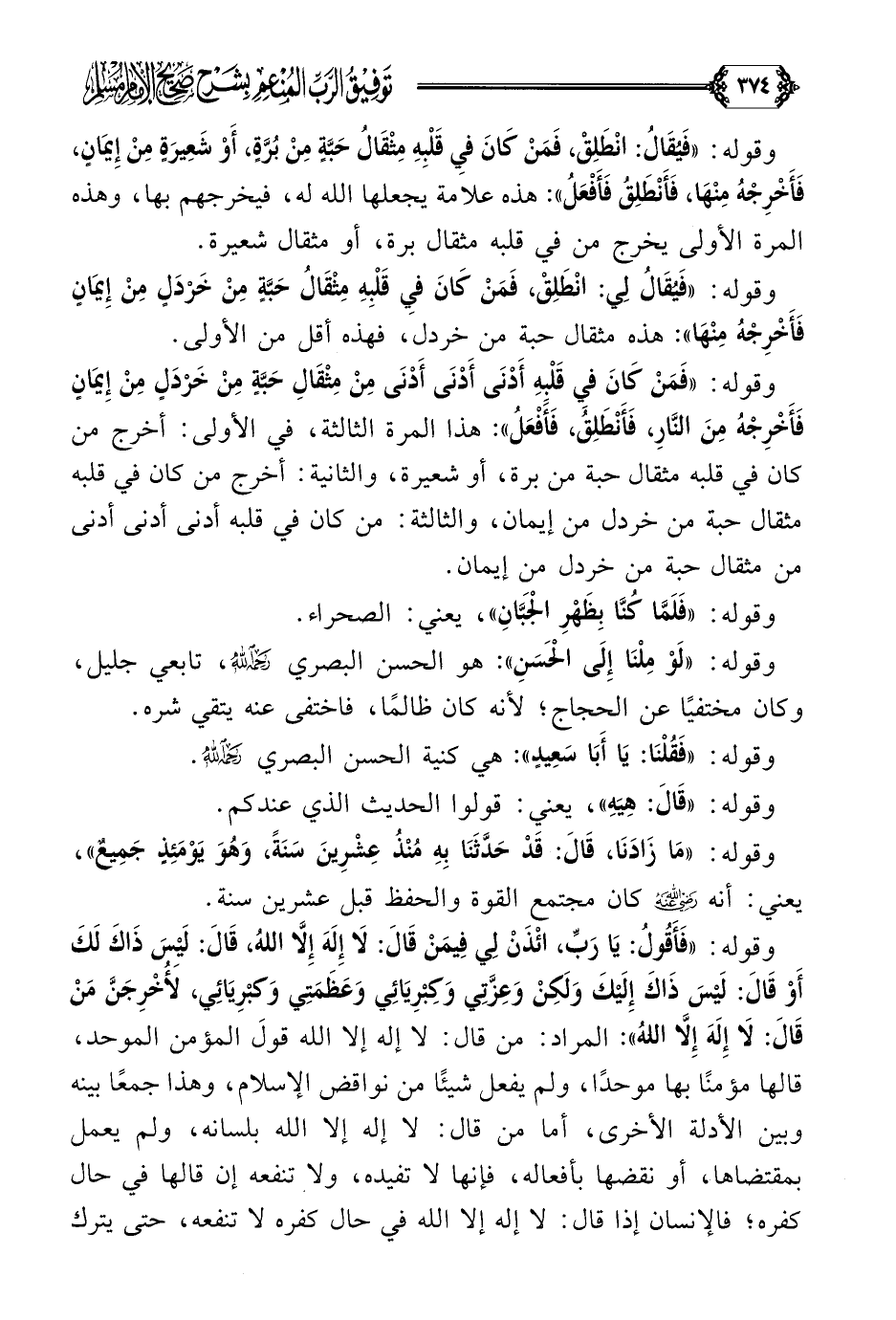 وقوله: ((فَأَقُولُ: يَا رَبِّ، ائْذَنْ لِي فِيمَنْ قَالَ: لَا إِلَهَ إِلَّا اللهُ، قَالَ: لَيْسَ ذَاكَ لَكَ أَوْ قَالَ: لَيْسَ ذَاكَ إِلَيْكَ وَلَكِنْ وَعِزَّتِي وَكِبْرِيَائِي وَعَظَمَتِي وَكبْرِيَائِي، لَأُخْرِجَنَّ مَنْ قَالَ: لَا إِلَهَ إِلَّا اللهُ)) المراد: من قال: لا إله إلا الله قولَ المؤمن الموحد، قالها مؤمنًا بها موحدًا، ولم يفعل شيئًا من نواقض الإسلام، وهذا جمعًا بينه وبين الأدلة الأخرى، أما من قال: لا إله إلا الله بلسانه، ولم يعمل بمقتضاها، أو نقضها بأفعاله، فإنها لا تفيده، ولا تنفعه إن قالها في حال كفره؛ فالإنسان إذا قال: لا إله إلا الله في حال كفره لا تنفعه، حتى يترك