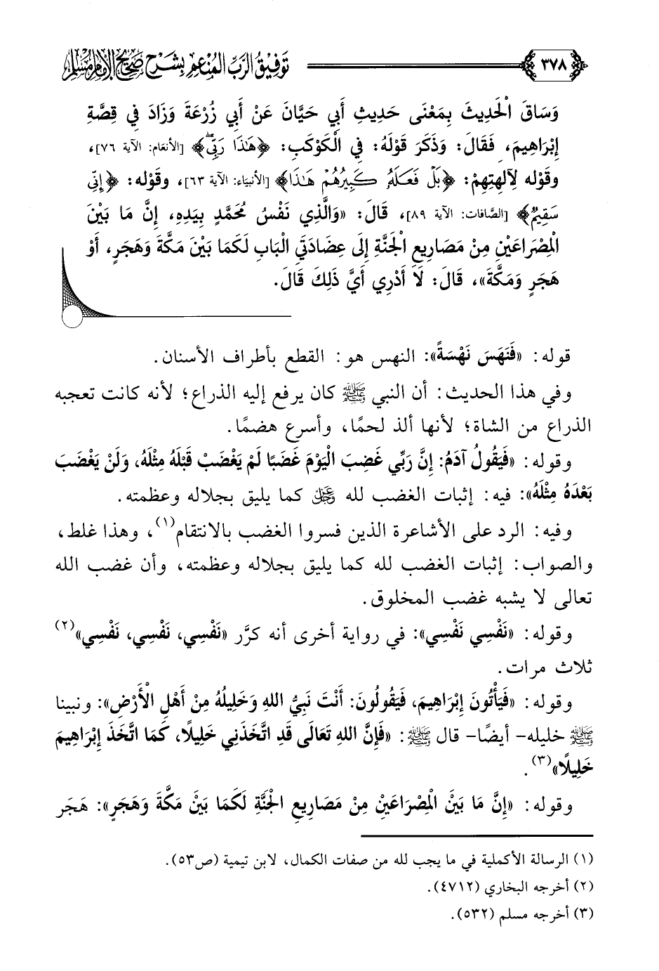 وَسَاقَ الْحَدِيثَ بِمَعْنَى حَدِيثِ أَبِي حَيَّانَ عَنْ أَبِي زُرْعَةَ وَزَادَ فِي قِصَّةِ إِبْرَاهِيمَ، فَقَالَ: وَذَكَرَ قَوْلَهُ: فِي الْكَوْكَبِ: {هَذَا رَبِّي}، وقَوْله لِآلِهَتِهِمْ: {بَلْ فَعَلَهُ كَبِيرُهُمْ هَذَا}، وقَوْله: {إِنِّي سَقِيمٌ}، قَالَ: وَالَّذِي نَفْسُ مُحَمَّدٍ بِيَدِهِ، إِنَّ مَا بَيْنَ الْمِصْرَاعَيْنِ مِنْ مَصَارِيعِ الْجَنَّةِ إِلَى عِضَادَتَيِ الْبَابِ لَكَمَا بَيْنَ مَكَّةَ وَهَجَرٍ، أَوْ هَجَرٍ وَمَكَّةَ، قَالَ: لَا أَدْرِي أَيَّ ذَلِكَ قَالَ.