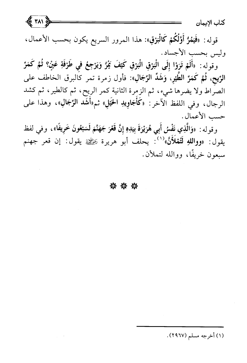 وقوله: ((أَلَمْ تَرَوْا إِلَى الْبَرْقِ الْبَرْقِ كَيْفَ يَمُرُّ وَيَرْجِعُ فِي طَرْفَةِ عَيْنٍ؟ ثُمَّ كَمَرِّ الرِّيحِ، ثُمَّ كَمَرِّ الطَّيْرِ، وَشَدِّ الرِّجَالِ)) فأول زمرة تمر كالبرق الخاطف على الصراط ولا يضرها شيء، ثم الزمرة الثانية كمر الريح، ثم كالطير، ثم كشد الرجال، وفي اللفظ الآخر: ((كَأَجَاوِيدِ الخَيْلِ)) ثم ((أَشَد الرِّجَالِ))، وهذا على حسب الأعمال.