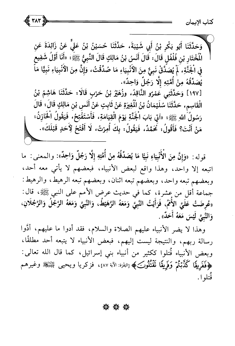 [١٩٧] وَحَدَّثَنِي عَمْرٌو النَّاقِدُ، وزُهَيْرُ بْنُ حَرْبٍ قَالَا: حَدَّثَنَا هَاشِمُ بْنُ الْقَاسِمِ، حَدَّثَنَا سُلَيْمَانُ بْنُ الْمُغِيرَةِ عَنْ ثَابِتٍ عَنْ أَنَسِ بْنِ مَالِكٍ قَالَ: قَالَ رَسُولُ اللَّهِ صلى الله عليه وسلم: ((آتِي بَابَ الْجَنَّةِ يَوْمَ الْقِيَامَةِ، فَأَسْتَفْتِحُ، فَيَقُولُ الْخَازِنُ: مَنْ أَنْتَ؟ فَأَقُولُ: مُحَمَّدٌ، فَيَقُولُ: بِكَ أُمِرْتُ، لَا أَفْتَحُ لِأَحَدٍ قَبْلَكَ)).