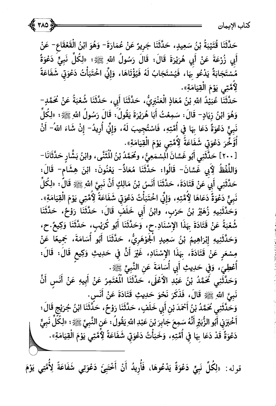[٢٠٠] حَدَّثَنِي أَبُو غَسَّانَ الْمِسْمَعِيُّ، ومُحَمَّدُ بْنُ الْمُثَنَّى، وابْنُ بَشَّارٍ حَدَّثَانَا- وَاللَّفْظُ لِأَبِي غَسَّانَ- قَالُوا: حَدَّثَنَا مُعَاذٌ- يَعْنُونَ: ابْنَ هِشَامٍ- قَالَ: حَدَّثَنِي أَبِي عَنْ قَتَادَةَ، حَدَّثَنَا أَنَسُ بْنُ مَالِكٍ أَنَّ نَبِيَّ اللَّهِ صلى الله عليه وسلم قَالَ: ((لِكُلِّ نَبِيٍّ دَعْوَةٌ دَعَاهَا لِأُمَّتِهِ، وَإِنِّي اخْتَبَأْتُ دَعْوَتِي شَفَاعَةً لِأُمَّتِي يَوْمَ الْقِيَامَةِ)).