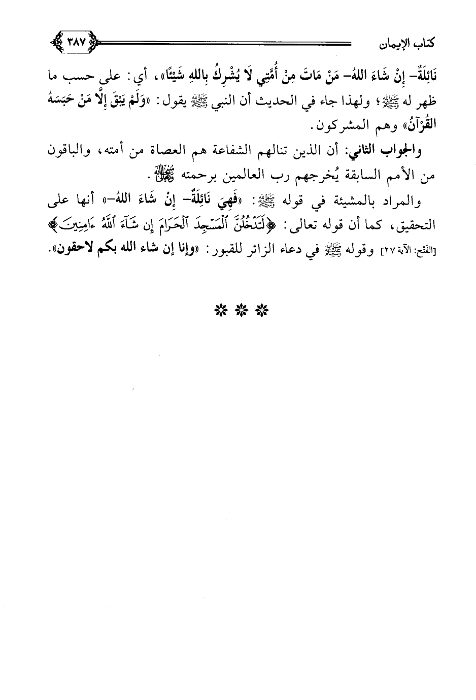 والمراد بالمشيئة في قوله صلى الله عليه وسلم: ((فَهِيَ نَائِلَةٌ- إِنْ شَاءَ اللَّهُ-)) أنها على التحقيق، كما في قوله تعالى: {لتدخلن إن شاء الله آمنين ... } وقوله صلى الله عليه وسلم في دعاء الزائر للقبور: ((وإنا إن شاء الله بكم لاحقون)).