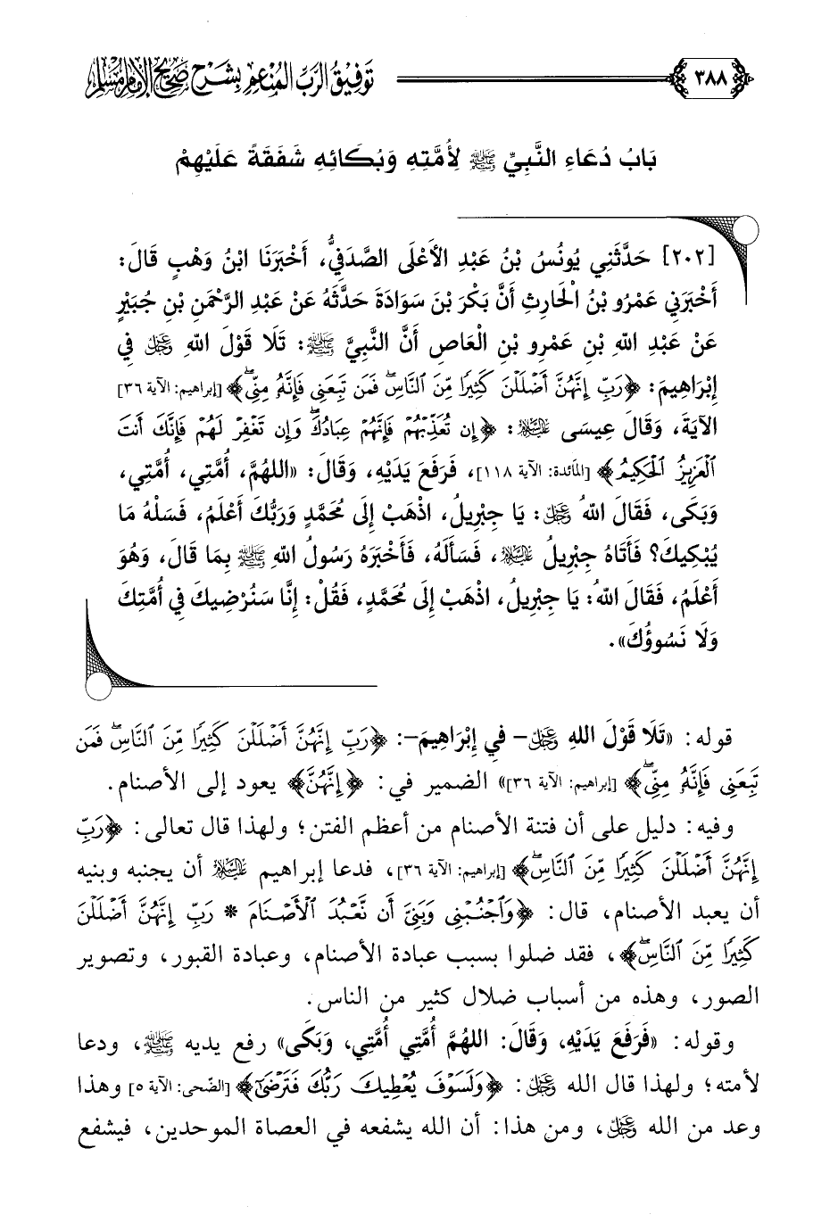 [٢٠٢] حَدَّثَنِي يُونُسُ بْنُ عَبْدِ الأَعْلَى الصَّدَفِيُّ، أَخْبَرَنَا ابْنُ وَهْبٍ قَالَ: أَخْبَرَنِي عَمْرُو بْنُ الْحَارِثِ أَنَّ بَكْرَ بْنَ سَوَادَةَ حَدَّثَهُ عَنْ عَبْدِ الرَّحْمَنِ بْنِ جُبَيْرٍ عَنْ عَبْدِ اللَّهِ بْنِ عَمْرِو بْنِ الْعَاصِ أَنَّ النَّبِيَّ صلى الله عليه وسلم: تَلَا قَوْلَ اللَّهِ عز وجل فِي إِبْرَاهِيمَ: {رَبِّ إِنَّهُنَّ أَضْلَلْنَ كَثِيرًا مِنَ النَّاسِ فَمَنْ تَبِعَنِي فَإِنَّهُ مِنِّي} الآيَةَ، وَقَالَ عِيسَى عليه السلام: {إِنْ تُعَذِّبْهُمْ فَإِنَّهُمْ عِبَادُكَ وَإِنْ تَغْفِرْ لَهُمْ فَإِنَّكَ أَنْتَ الْعَزِيزُ الْحَكِيمُ}، فَرَفَعَ يَدَيْهِ، وَقَالَ: ((اللَّهُمَّ، أُمَّتِي، أُمَّتِي، وَبَكَى، فَقَالَ اللَّهُ عز وجل: يَا جِبْرِيلُ، اذْهَبْ إِلَى مُحَمَّدٍ وَرَبُّكَ أَعْلَمُ، فَسَلْهُ مَا يُبْكِيكَ؟ فَأَتَاهُ جِبْرِيلُ عليه السلام، فَسَأَلَهُ، فَأَخْبَرَهُ رَسُولُ اللَّهِ صلى الله عليه وسلم بِمَا قَالَ، وَهُوَ أَعْلَمُ، فَقَالَ اللَّهُ: يَا جِبْرِيلُ، اذْهَبْ إِلَى مُحَمَّدٍ، فَقُلْ: إِنَّا سَنُرْضِيكَ فِي أُمَّتِكَ وَلَا نَسُوؤُكَ)).