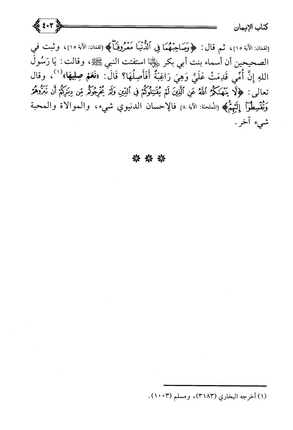 ثم قال: {وصاحبهما في الدنيا معروفًا}، وثبت في الصحيحين أن أسماء بنت أبي بكر رضي الله عنها استفتت النبي صلى الله عليه وسلم، وقالت: ((يَا رَسُولَ اللَّهِ إِنَّ أُمِّي قَدِمَتْ عَلَيَّ وَهِيَ رَاغِبَةٌ أَفَأَصِلُهَا؟ )) قَالَ: ((نَعَمْ صِلِيهَا)) (¬١)، وقال تعالى: {لا ينهاكم الله عن الذين لم يقاتلوكم في الدين ولم يخرجوكم من دياركم أن تبروهم وتقسطوا إليهم} فالإحسان الدنيوي شيء، والموالاة والمحبة شيء آخر.