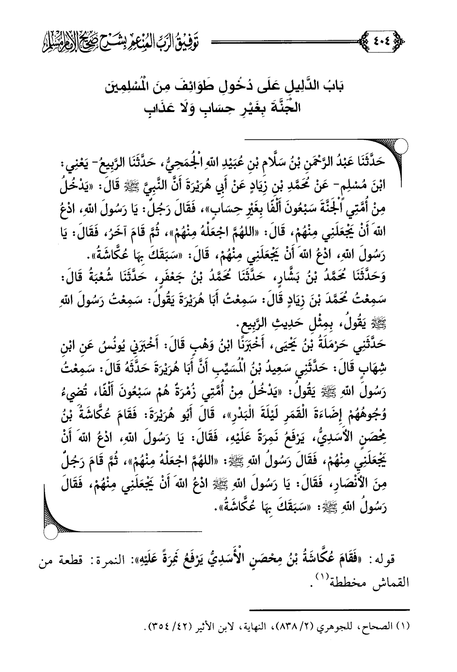 حَدَّثَنِي حَرْمَلَةُ بْنُ يَحْيَى، أَخْبَرَنَا ابْنُ وَهْبٍ قَالَ: أَخْبَرَنِي يُونُسُ عَنِ ابْنِ شِهَابٍ قَالَ: حَدَّثَنِي سَعِيدُ بْنُ الْمُسَيِّبِ أَنَّ أَبَا هُرَيْرَةَ حَدَّثَهُ قَالَ: سَمِعْتُ رَسُولَ اللَّهِ صلى الله عليه وسلم يَقُولُ: ((يَدْخُلُ مِنْ أُمَّتِي زُمْرَةٌ هُمْ سَبْعُونَ أَلْفًا، تُضِيءُ وُجُوهُهُمْ إِضَاءَةَ الْقَمَرِ لَيْلَةَ الْبَدْرِ))، قَالَ أَبُو هُرَيْرَةَ: فَقَامَ عُكَّاشَةُ بْنُ مِحْصَنٍ الأَسَدِيُّ، يَرْفَعُ نَمِرَةً عَلَيْهِ، فَقَالَ: يَا رَسُولَ اللَّهِ، ادْعُ اللَّهَ أَنْ يَجْعَلَنِي مِنْهُمْ، فَقَالَ رَسُولُ اللَّهِ صلى الله عليه وسلم: ((اللَّهُمَّ اجْعَلْهُ مِنْهُمْ))، ثُمَّ قَامَ رَجُلٌ مِنَ الأَنْصَارِ، فَقَالَ: يَا رَسُولَ اللَّهِ صلى الله عليه وسلم ادْعُ اللَّهَ أَنْ يَجْعَلَنِي مِنْهُمْ، فَقَالَ رَسُولُ اللَّهِ صلى الله عليه وسلم: ((سَبَقَكَ بِهَا عُكَّاشَةُ)).