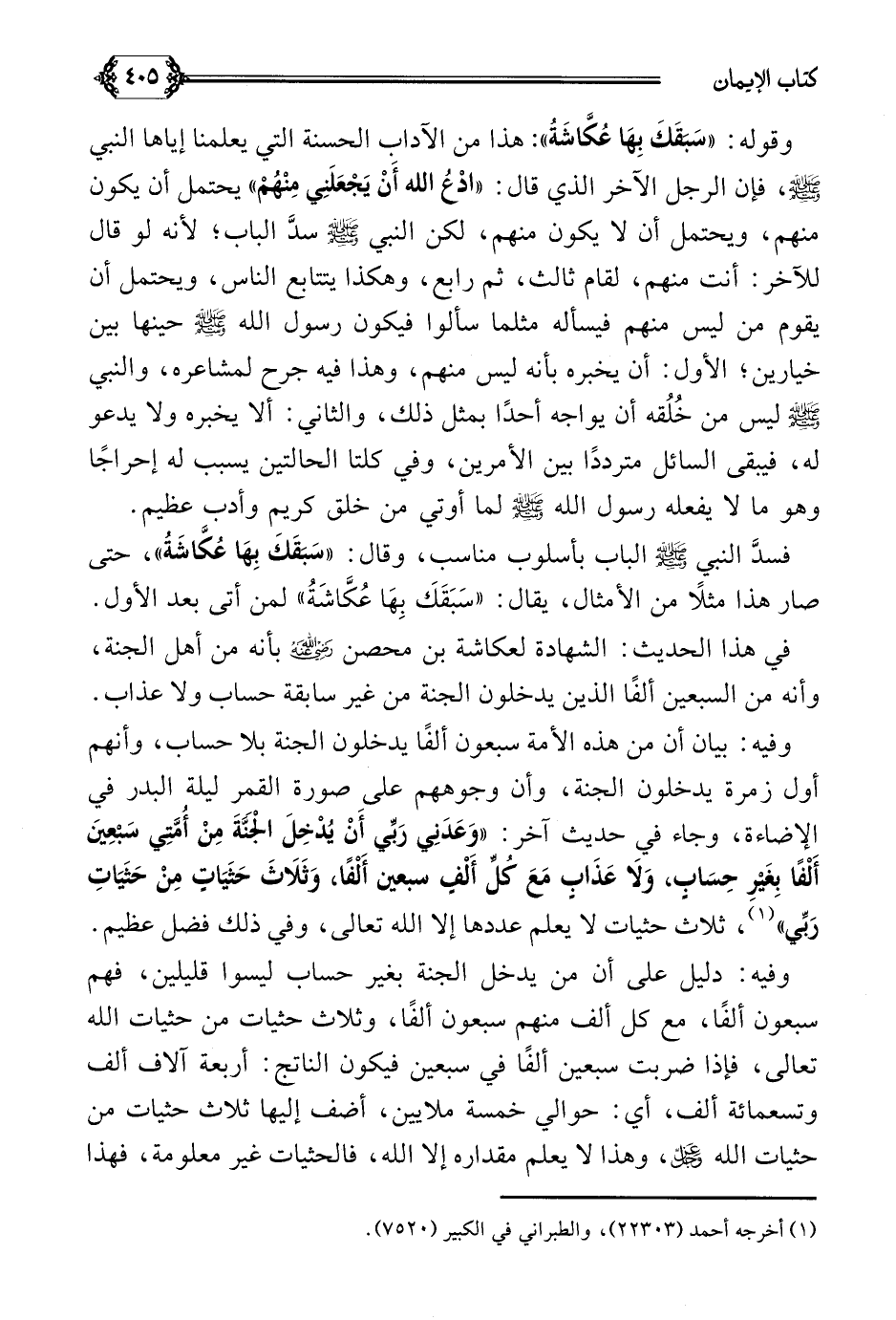 وقوله: ((سَبَقَكَ بِهَا عُكَّاشَةُ)) هذا من الآداب الحسنة التي يعلمنا إياها النبي صلى الله عليه وسلم، فإن الرجل الآخر الذي قال: ((ادْعُ الله أَنْ يَجْعَلَنِي مِنْهُمْ)) يحتمل أن يكون منهم، ويحتمل أن لا يكون منهم، لكن النبي صلى الله عليه وسلم سدَّ الباب؛ لأنه لو قال للآخر: أنت منهم، لقام ثالث، ثم رابع، وهكذا يتتابع الناس، ويحتمل أن يقوم من ليس منهم فيسأله مثلما سألوا فيكون رسول الله صلى الله عليه وسلم حينها بين خيارين؛ الأول: أن يخبره بأنه ليس منهم، وهذا فيه جرح لمشاعره، والنبي صلى الله عليه وسلم ليس من خلقه أن يواجه أحدا بمثل ذلك، والثاني: ألا يخبره ولا يدعو له، فيبقى في نفس السائل مترددا بين الأمرين، وفي كلتا الحالتين يسبب له إحراجا وهو ما لا يفعله رسول الله صلى الله عليه وسلم لما أوتي من خلق كريم وأدب عظيم.